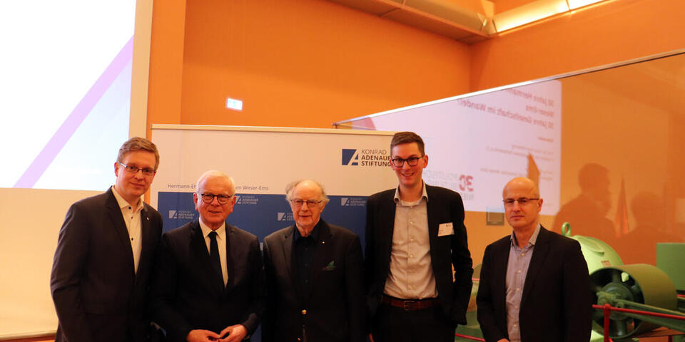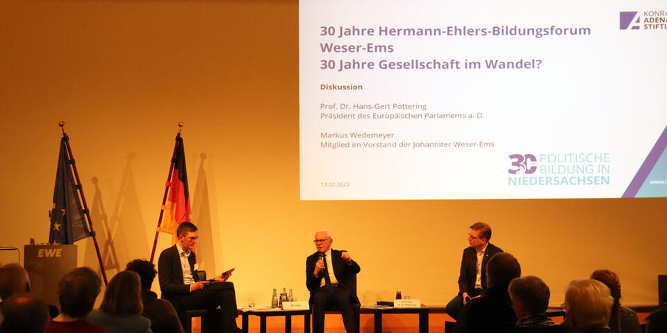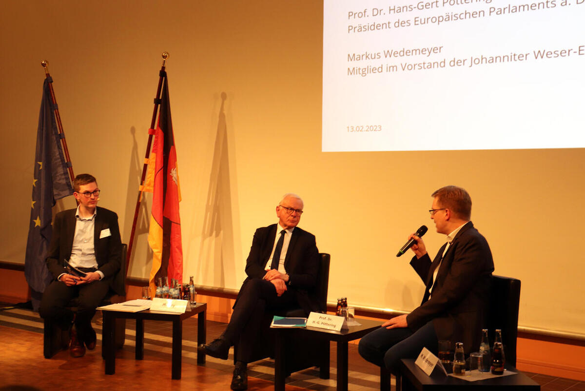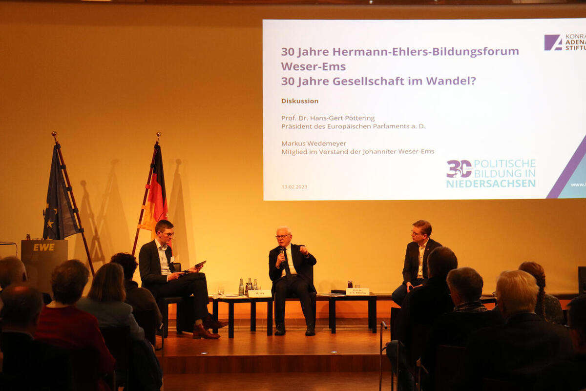 In der Podiumsdiskussion zum 30-jährigen Bestehen dss Hermann-Ehlers-Bildungsforums Weser-Ems sprach dessen Leiter Manuel Ley mit dem ehemaligen Präsidenten des Europäisches Parlamentes, Prof. Hans-Gert Pöttering, und Markus Wedemeyer.
