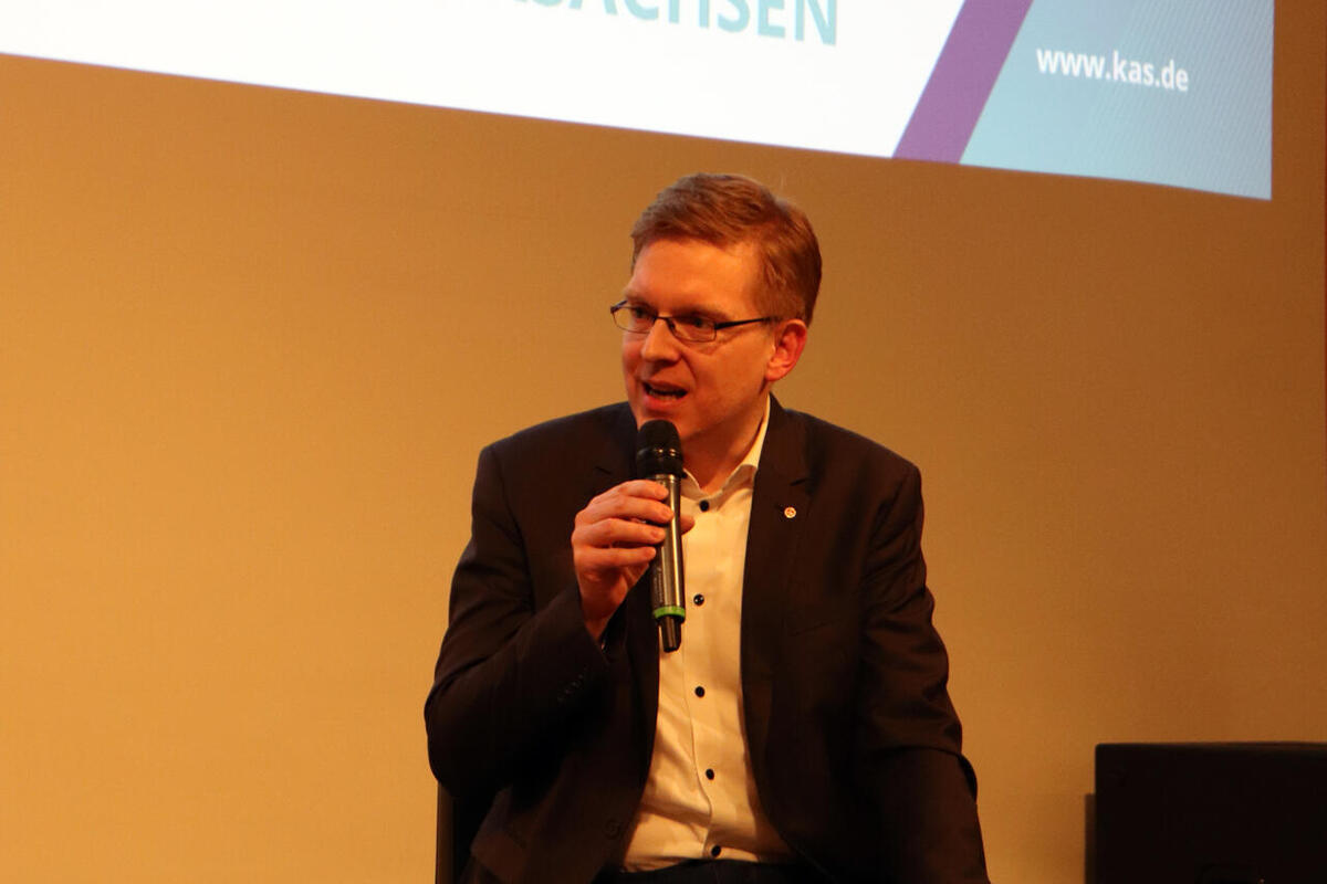 Im anschließenden Gespräch auf dem Podium stellte Manuel Ley als Leiter des Bildungsforums, welches zur Konrad-Adenauer-Stiftung gehört, kritische Fragen zur Gemeinsamkeit der EU-Staaten. Pöttering als Vertreter der Politik ließ diese nicht gelten: Der Frieden in Europa sei ein herausragender politischer Erfolg, den wir nicht als selbstverständlich nehmen sollten. Auch Markus Wedemeyer, der auf der Bühne die gesellschaftlichen Positionen vertrat, betonte die Wirklichkeit jenseits der politischen Zuspitzungen: Dass man heute quer durch Europa reisen oder in anderen Ländern studieren könne sei ebenso eine Errungenschaft wie die gegenseitige Hilfe in Katastrophenlagen, so seine Beispiele. Selbst in schwierigen Situationen, etwa als in der Pandemie Grenzen geschlossen wurden, ging es nicht um Abschottung. Gegenseitige Hilfe blieb selbstverständlich. Als Beispiel nannte Wedemeyer die Übernahme schwerst kranker Menschen aus Frankreich nach Deutschland, als die französischen Kapazitäten zur Behandlung erschöpft waren.