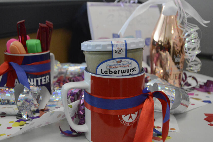 Auf den Tag genau 15 Jahre, nachdem Anke Siemers als Mitarbeiterin im KundenServiceCenter der Johanniter-Unfall-Hilfe am Standort Oldenburg angefangen hatte, beendet sie ihre hauptamtliche Tätigkeit. Am 15. Mai geht sie in den Ruhestand, aus gesundheitlichen Gründen etwas früher als geplant. „Es hat mir riesigen Spaß gemacht und war eine spannende Aufgabe, aber die Knochen machen nicht mehr mit“, erzählt die 64-Jährige. Zum Abschied gab es von den Kolleginnen und Kollegen einen Präsentkorb unter anderem mit Leberwurst, die Anke Siemers gerne isst und von der auch ihr Hund Paule immer eine Scheibe bekommt.