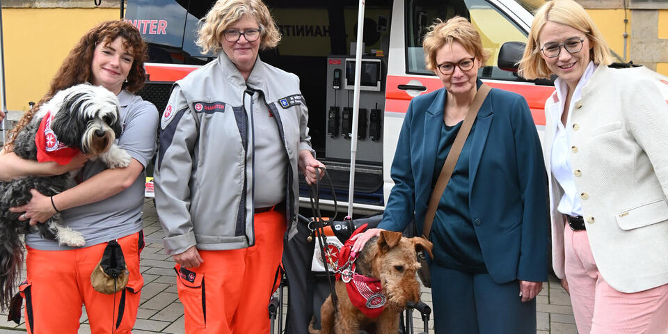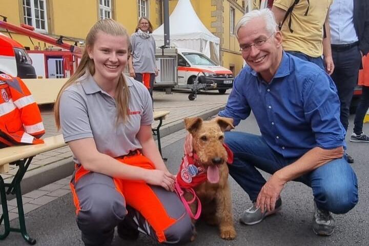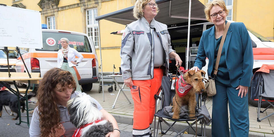 Die Fahrzeuge sind gereinigt, die Bobbycars wieder heile in ihrer Garage angekommen und die vierbeinigen Stars des Johanniter-Standes bei Tag der Niedersachsen haben sich ausgeschlafen. Die Johanniter haben sich beim Tag der Niedersachsen in Osnabrück wieder einmal von ihrer besten Seite präsentiert. Die ehrenamtlichen Helferinnen und Helfern um die Ortsbeauftragte Marita Würth zeigten auf dem Stand auf der Technikmeile auf dem Neuen Graben außergewöhnliche Fahrzeuge wie den Gerätewagen Sanität (GW San), den Einsatzleitwagen (ELW) und den Hundeanhänger der Rettungshundestaffel. Der stand nicht nur leer herum, sondern war gleichzeitig der Pausenraum für die Stars des Johanniter-Auftritts: die Hunde der Rettungshundestaffel mit ihren Hundeführerinnen und Hundeführern. Vor allem die Kinder konnten gar nicht genug bekommen von den schlauen, in der Menschenrettung ausgebildeten Vierbeinern. Auch ältere Semester entdeckten das Kind in sich, wenn Mette und ihre Freunde sie begrüßten. Sowohl Daniela Behrens, Innenministerin des Landes Niedersachsen, Osnabrücks Oberbürgermeisterin Katharina Pötter (CDU) als auch der CDU-Bundestagsabgeordnete Dr. Mathias Middelbergbesuchten den Stand der Johanniter, plauderten mit den Ehrenamtlichen und streichelten die Hunde. Die freuten sich über so viel Aufmerksamkeit. Daniela Behrens war besonders angetan von Therapiehund Henry, der mit den Kindern um kleine Gewinne würfelte. Frauchen Maria Schröder hatte eigens einen großen Schaumstoffwürfel mitgebracht, mit dem Henry die Gewinnzahlen erwürfeln konnte. Terrier-Dame Mette mit Rettungshundeführerin Janne Klotz ließ sich geduldig mit MdB Middelberg fotografieren. Als Star weiß die Terrier-Dame, was sie ihre Fans schuldig ist.
