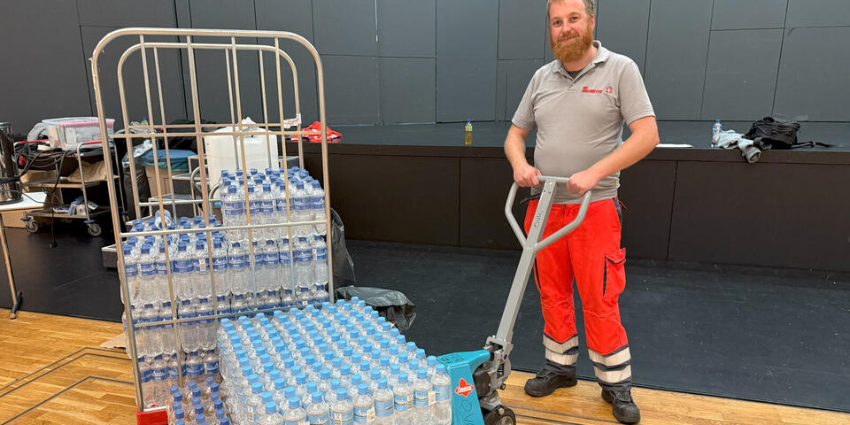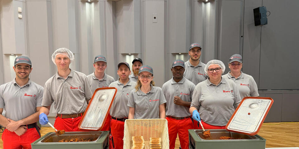Weil die Osnabrücker Johanniterinnen und Johanniter beim Stand und diversen anderen Diensten eingebunden waren, rückte Unterstützung aus Aurich und Ems-Vechte an. Die Betreuungsgruppen hatten einen Spezialauftrag: Sie verteilten Essen, das die Verpflegungsgruppe des Ortsverbands Jeverland gekocht hatte, an Teilnehmende des Tages der Niedersachsen. Von kleinen Ballettmäuschen über schlagkräftige Kampfsportler bis zum Jesidischen Trachtenverein wurden alle versorgt. Insgesamt wurden 1122-mal Frühstück ausgegeben und 893-mal Mittagessen, davon 235 vegetarische Gerichte. Das zehnköpfige Team aus Ems-Vechte, geführt vom stellvertretenden Ortsbeauftragten Steffen Vieth und Zugführer Tobias Dwucet, kümmerte sich um die Essensausgabe in der OsnabrückHalle. „Das war eine tolle Zusammenarbeit“, betont Vieth und bedankte sich beim Stadthallen-Team für die Ausleihe eines Hubwagens. „Ohne dem hätten wir die Paletten mit den Getränken per Hand schleppen müssen.“ Die Auricher Betreuungsgruppe unter Leitung des Ortsbeauftragten Sebastian Schulze und Thomas Kappenhagen war in der Domschule und gab dort das Essen aus.