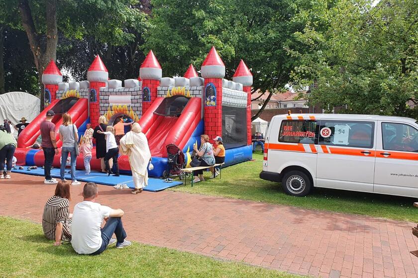 Bei herrlichem Sonnenschein erlebten die Menschen im Harlingerland drei tolle Tage beim Wittmunder Bürgermarkt. Mittendrin waren die Johanniter des Ortsverbands Wittmund in doppelter Funktion. Auf dem Kirchplatz gab es für die Kleinsten ein großes Spaßpaket. Reges Treiben gab es an und auf der Hüpfburg der Johanniter. Die Helfer, darunter Florian Grütter, Jelke Onken und Timmy Ahlrichs, hatten ihre Augen überall und passten auf, dass keinem der kleinen Bürgermarktbesuchern etwas passiert. Vergleichsweise ruhige Tage hatten die Helferinnen und Helfer im Sanitätsdienst. Abgesehen von der Ausgabe einiger Kühlpacks wurden keine Einsätze gemeldet. Die Stimmung war sehr ausgelassen und am Rande des Geschehens gab es oft Gelegenheit zu Gesprächen mit den Besuchern und Freunden. Für die Kinder boten die Johanniter pudergezuckerte Waffeln zur Stärkung vor der nächsten Runde Hüpfburg-Springen an. Timmy Ahlrichs meinte: „Solche Einsätze sind mir die liebsten!“