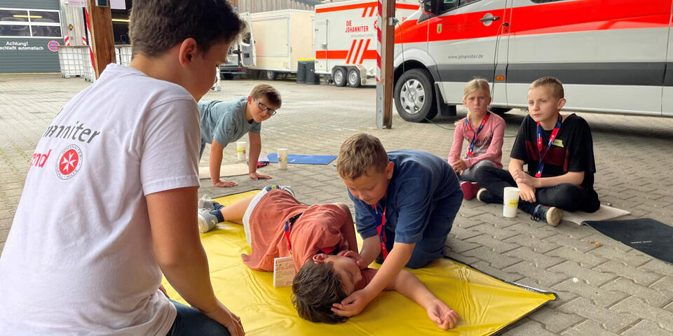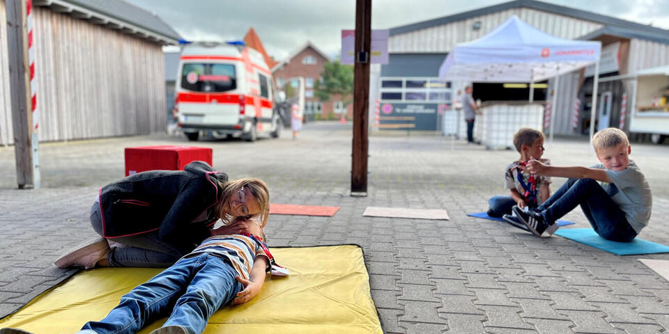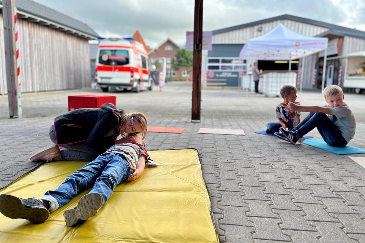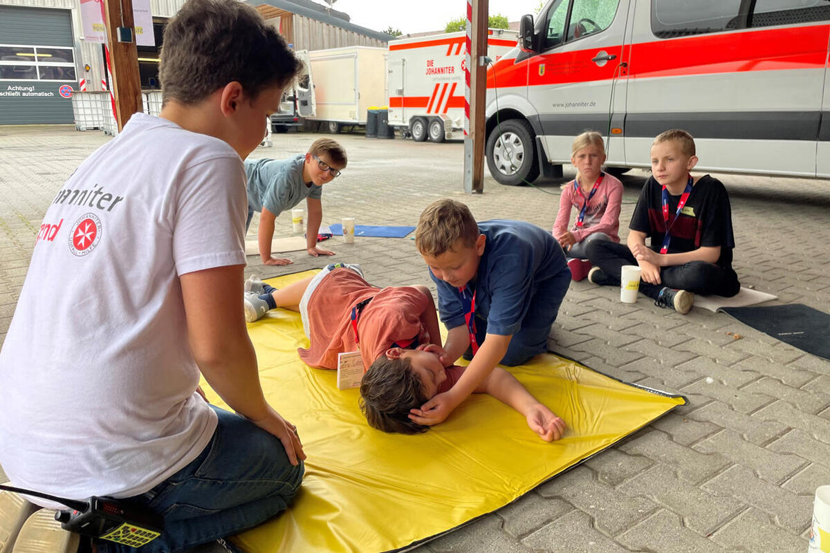 Weder der gelegentliche Regen noch die grauen Wolken konnten die Begeisterung der jungen Teilnehmer trüben: Erwartungsvoll und aufmerksam hingen die Kinder an den Lippen der sechs Ehrenamtlichen sowie der fünf Johanniter-Jugendlichen des Ortsverbands Garrel unter der Leitung von Ausbildungsleiter Jan Ferneding. An sechs verschiedenen Stationen erlernten die Kinder spielerisch die Grundlagen der Ersten Hilfe. Angefangen bei der Vorstellung der Johanniter und deren Bedeutung bis hin zur Simulation von Rettungssituationen im Team – jedes Kind wurde auf eine Reise mitgenommen, die nicht nur Wissen, sondern auch Selbstvertrauen vermittelte. Sie lernten, wie die stabile Seitenlage und die Wundversorgung kleinerer Blessuren funktioniert, aber auch das Vorgehen im Notfall sowie die Wiederbelebung wurden thematisiert. Die spannendste Station aber war der Rettungswagen – da waren sich alle Jungen und Mädchen einig.