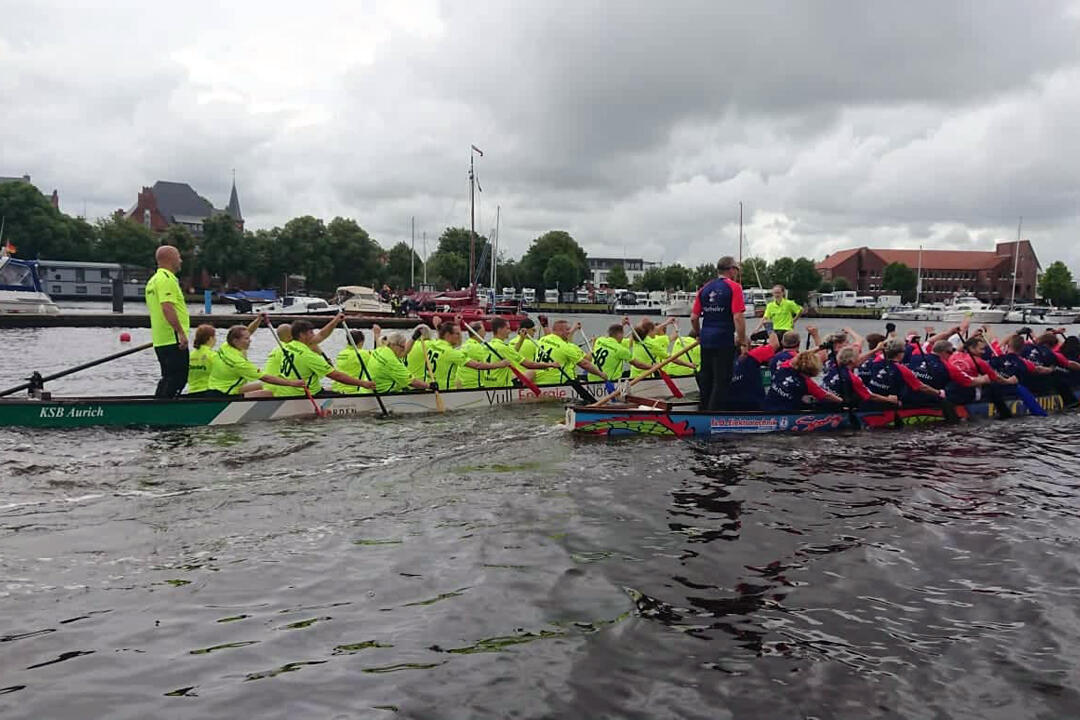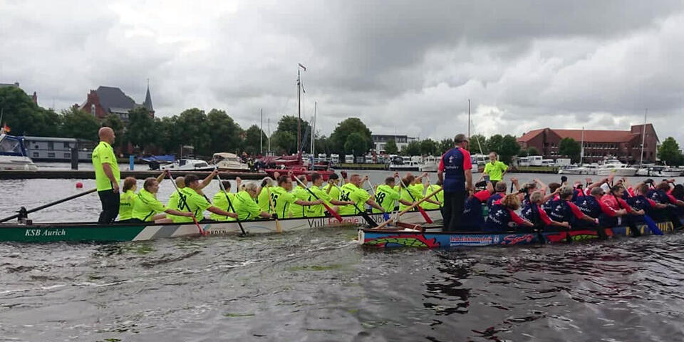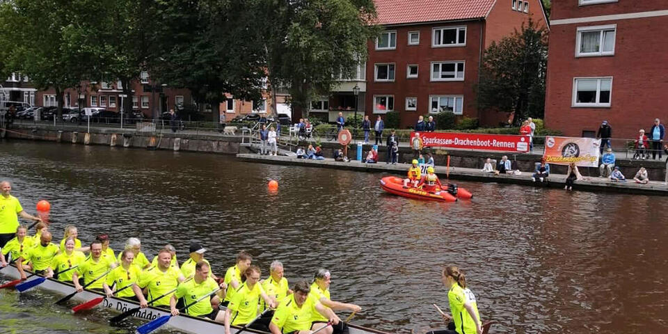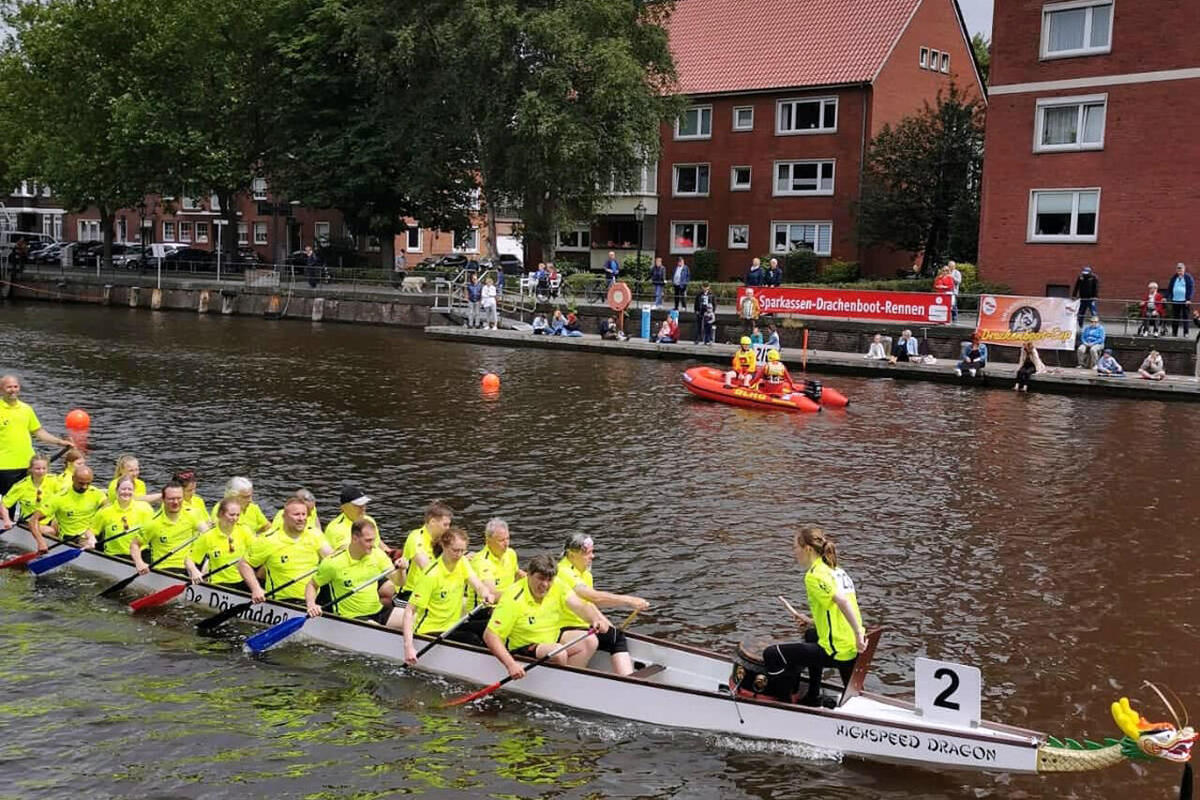 Beim Drachenboot-Rennen des Emder Rudervereins über die Hafenmeile waren 36 Teams mit rund 800 Paddlern gestartet. Gefahren wurde in verschiedenen Kategorien. Die Oldenburger Johanniter starteten in der Fun-Klasse für Gelegenheitspaddler in der Kategorie 10-Bank. Dabei sitzen 18 Paddler jeweils zu zweit im Boot, dazu gesellen sich eine Trommlerin für den Takt und ein Steuermann oder eine Steuerfrau. Die „Sons of Paddel“ waren mit einem Team von 23 Leuten angereist, jede und jeder wurde bei mindestens zwei Rennen eingesetzt. Die Herausforderung beim Drachenboot-Fahren ist, dass es nur im Team funktioniert. Wenn auch nur ein Paddler aus dem Takt gerät, droht dem ganzen Team der Untergang. Und das nicht nur in Bezug auf das Rennen, sondern ganz buchstäblich. Unruhe im Boot kann sich schnell bis zum Kentern aufschaukeln. Das Oldenburger Team hat auf der Emder Hafenmeile unter Beweis gestellt: Es funktioniert. Meistens jedenfalls. Wer noch Interesse hat: Die „Sons of Paddle“ trainieren montags auf dem Tweelbäker See.