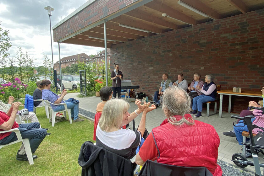 Das seit Anfang März virtuell stattfindende „Singen im Innenhof“ wird seit dem 1. Juli in Präsenz im Innenhof der Gemeinwesenarbeit Oldenburg-Kreyenbrück, Alter Postweg 1, durchgeführt. Die Sängerinnen und Sänger treffen sich dienstags um 15.30 Uhr, Interessierte dürfen jederzeit hinzukommen. Das Angebot richtet sich an Menschen mit und ohne Demenz und soll vor allem zum Mitmachen anregen. Infos gibt es bei Angela Exner-Wallmeier unter Telefon 0441 9719047. Das Projekt wird gefördert vom Bundesministerium für Familie, Senioren, Frauen und Jugend. Beteiligt sind neben den Johannitern und der Musikschule Oldenburg der Senioren- und Pflegestützpunkt der Stadt, die Alzheimergesellschaft, die GSG, das Demenz Netz Oldenburg und die Gemeinwesenarbeit Oldenburg-Kreyenbrück.