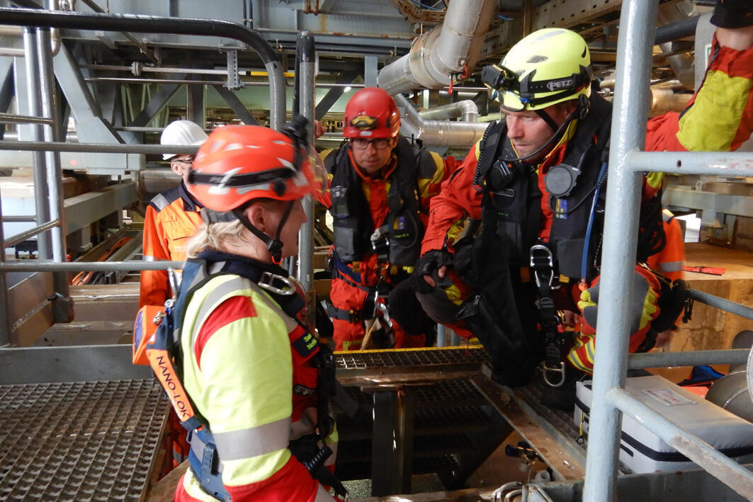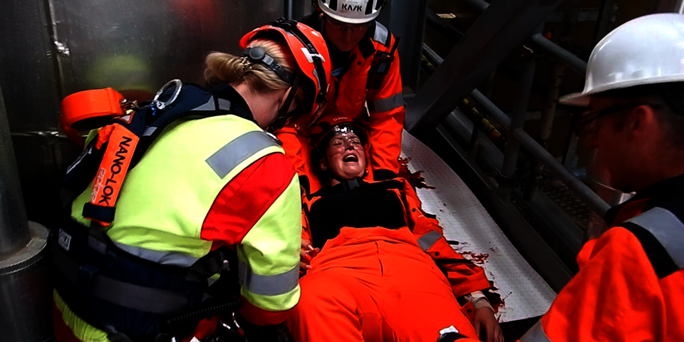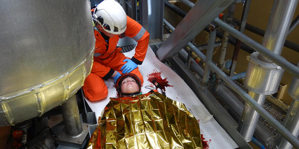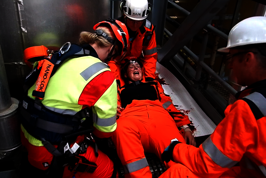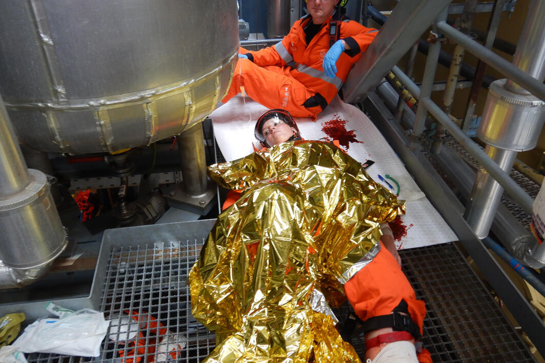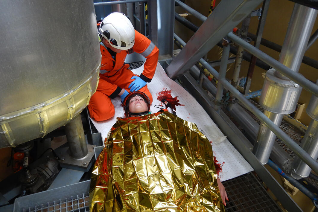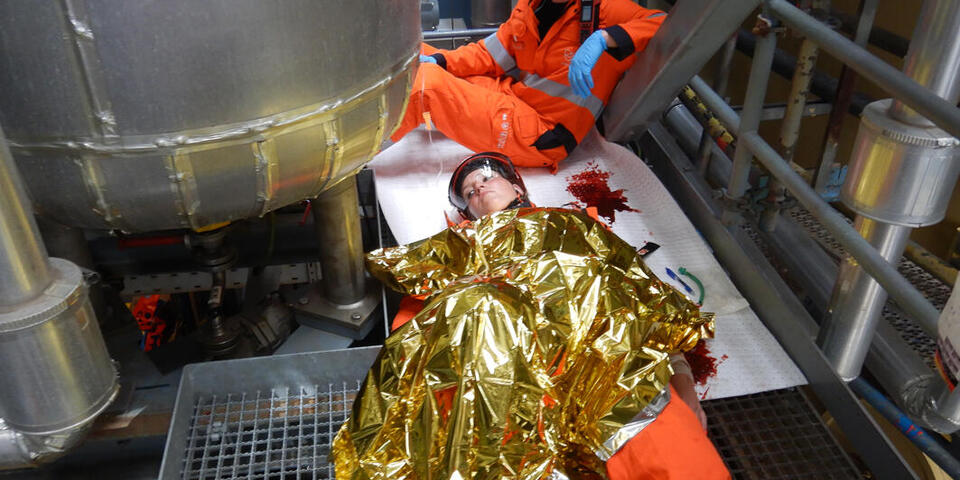 Ziemliches Geschrei auf der Mittelplate, Deutschlands einziger Ölbohrinsel. Eine Verletzte liegt nach einem Arbeitsunfall in dem Industriekomplex auf der künstlichen Insel vor der Küste von Schleswig-Holstein und brüllt wie am Spieß. "Die macht den Jungs richtig Feuer unterm Hintern", grinst Dr. med. Rüdiger Franz, Ärztlicher Leiter Offshore Rettung im Ortsverband Stedingen der Johanniter-Unfall-Hilfe. Die "Verletzte" ist Lena Rabenstein, Ausbilderin für Erste Hilfe Offshore und Mimin in der Realistischen Unfalldarstellung (RUD). Ihre Aufgabe bei dieser Übung, die vom Mittelplate-Betreiber Wintershall-DEA zusammen mit dem Havariekommando geplant und geleitet wurde: die Retter psychisch unter Druck setzen, um zu sehen, ob sie trotzdem noch gut arbeiten. Zudem hat Lena die weiteren Mimen und eine Übungspuppe geschminkt und präpariert. Beteiligt an der Übung waren insgesamt sechs Verletztendarsteller, so dass der Einsatz bereits eine ManV-Lage darstellte, sowie Mitarbeitende der Wintershall-DEA, die Feuerwehr Cuxhaven und die Bundespolizei. Aufgabe waren die Erstversorgung mehrere Verletzter durch Kräfte vor Ort, die Alarmierung von weiteren Einsatzkräften und deren Anflug per Helikopter sowie die Verlegung der Verletzten in Krankenhäuser.