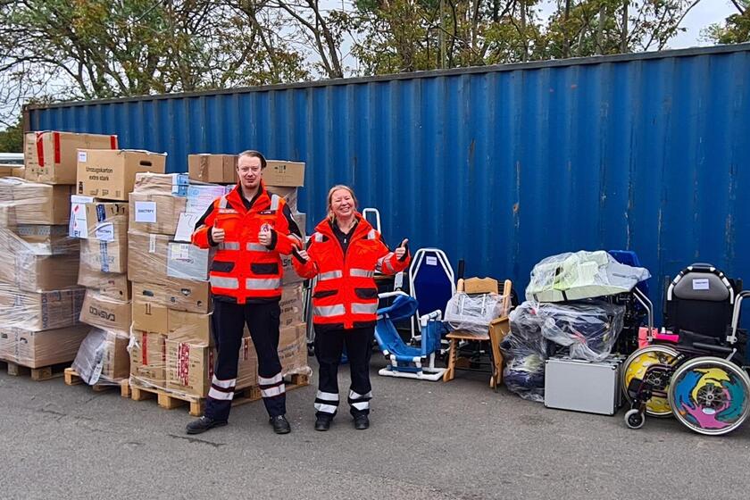 Die Auricher Lamberti-Kirchengemeinde, der Ortsverband Aurich der Johanniter-Unfall-Hilfe und die Johanniter-Hilfsgemeinschaft Ostfriesland-Wilhelmshaven hatten dazu aufgerufen, Verbandkästen zu spenden, um sie den schlecht ausgestatteten Rettungskräften in Paraguay zu übergeben. Mehr als 1200 Verbandkästen kamen in den 30 Tagen der Aktion „Zweite Wahl? Erste Hilfe!“ zusammen, zudem Sanitätsrucksäcke und ein Automatischer Externer Defibrillator (AED). Jetzt haben die Spenden den ersten Teil ihrer Reise angetreten. Andreas Töpfer, Ortsbeauftragter der Auricher Johanniter, und die ehrenamtliche Helferin Manuela Grever haben den bis unters Dach mit Sanitätsmaterial beladenen Lastwagen der Betreuungsgruppe nach Mainz zum Containerdienstleister gefahren. Mit dabei hatten sie zudem Kindergehhilfen und –rollstühle der Adam Medizintechnik GmbH aus Minden, die regelmäßig Material dem Partner der Auricher Spendenaktion, dem Kinderhilfswerk International Children Help (ICH) e.V., spenden. Diese Hilfsmittel sind ebenfalls für Paraguay bestimmt und wurden jetzt mit den Verbandkasten und Sanitätsrucksäcken aus der Auricher Aktion in einen Container und dann auf ein Schiff verladen.