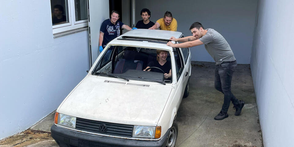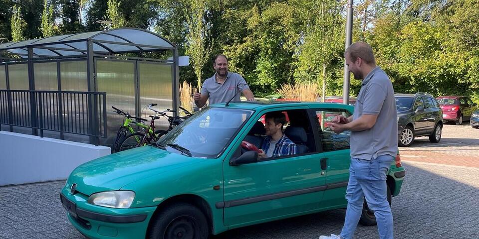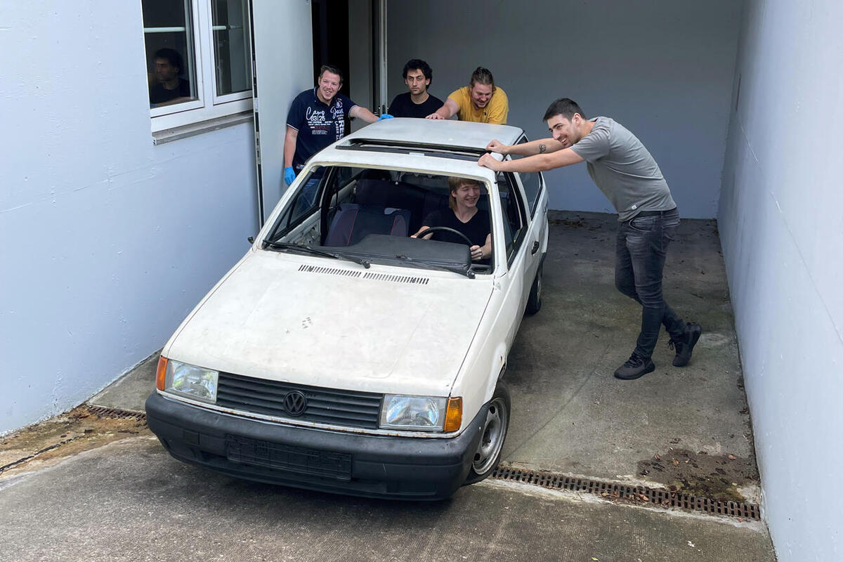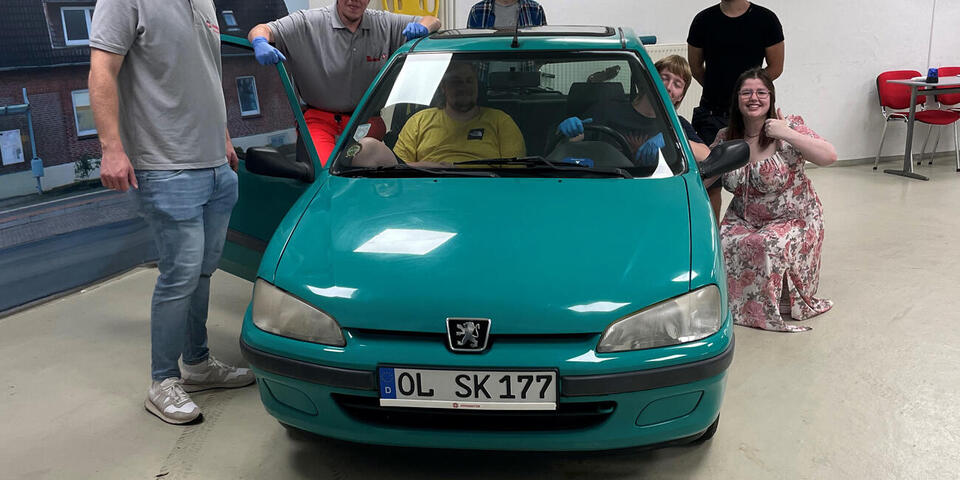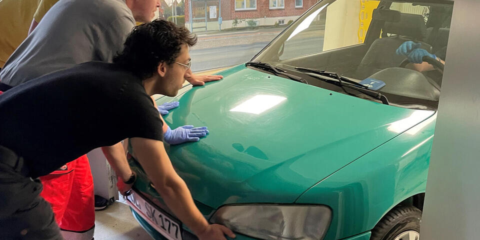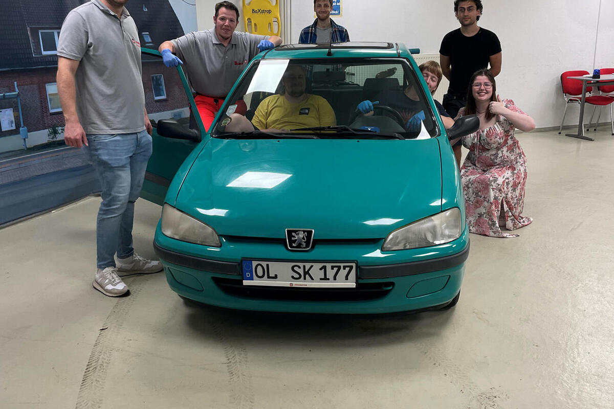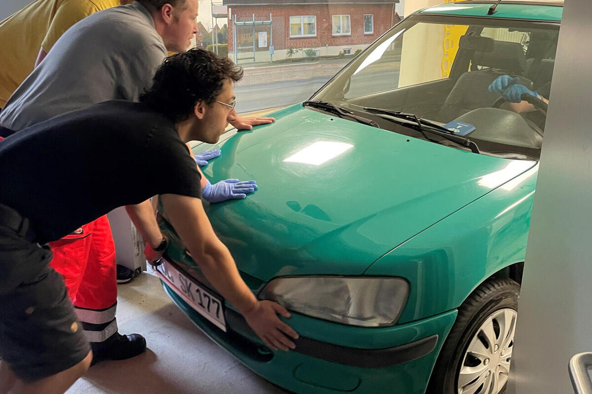 Was ist in diesem Auto nicht alles passiert? Leute haben sich Arme gebrochen, Beine und die Rippen, es gab Herzinfarkte, Schlaganfälle und überraschende Geburten. Menschen jammerten, schrieen, übergaben sich und starben. Blut spritzte, abgetrennte Körperteile lagen herum. 15 Jahre diente der weiße Polo der Johanniter-Unfall-Hilfe als realitätsnahes Übungsobjekt für die Ausbildung von Rettungskräften. Erst in der San-Arena der Rettungsschule Wesermarsch, an der bis zur Schließung der Lützow-Kaserne in Schwanewede die Sanitätssoldaten des Kommandos Schnelle Einsatzkräfte der Bundeswehr (ZSanDBw) áusgebildet wurden, danach in der San-Arena am heutigen Campus Oldenburg der Johanniter-Akademie. Jetzt hat das Fahrzeug seinen Dienst mehr als erfüllt und darf in den Ruhestand gehen. „Gefühlt hat jeder zweite Johanniter in unserem Regionalverband mindestens einmal einen Menschen in diesem Auto retten müssen“, sagt Campus-Leiterin Sonja Stolle. Der Neue, ein türkisgrüner Peugeot, ist bereits eingezogen. Dabei legten Mitarbeitende des Campus und Teilnehmende des aktuellen Rettungssanitäter-Kurses ordentlich mit Hand an. Natürlich ist das Fahrzeug präpariert, sämtliche Treib- und Betriebsstoffe sind abgelassen. Weil es nicht mehr fahren kann, musste es mit Muskelkraft in die San-Arena im Keller des Campus-Gebäudes verfrachtet werden. Kein Problem für die Anpackenden. Sie können nicht nur retten, sondern auch schieben.