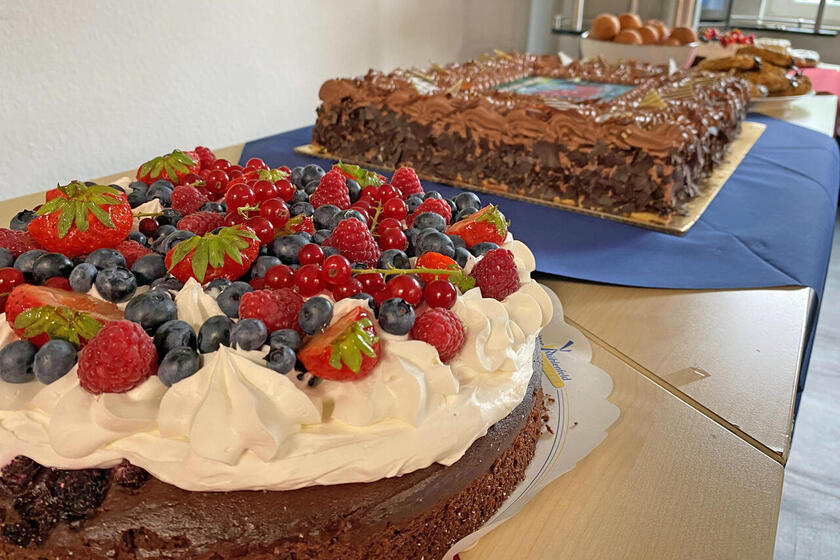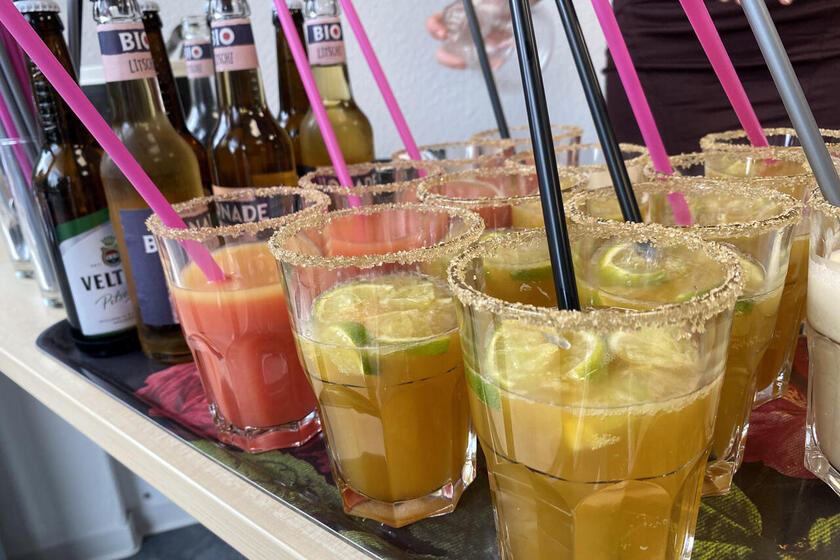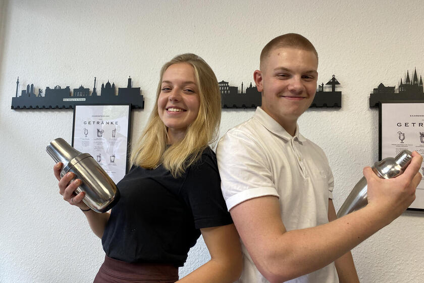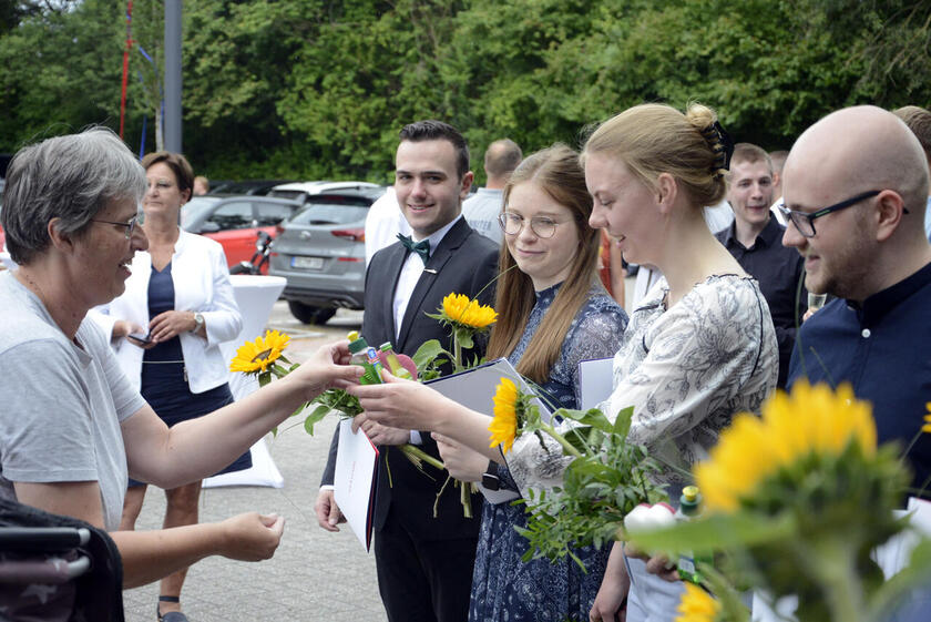 Anschließend gab es Zeugnisse, danach waren die Absolventen dran und bedankten sich ihrerseits bei allen am Unterricht und an der Prüfung Beteiligten. Für jede und jeden gab es eine Blume und ein dickes Danke in süßer Verpackung. Der Dank funktioniert aber auch in umgekehrter Richtung. Silke Schölzel, Reinigungskraft am Campus Oldenburg, überreichte jeder Absolventin und jedem Absolventen einen Reinigungsschwamm in Herzform und eine kleine Flasche Geschirrspüler. „Das ist ein kleiner Abschiedsgruß für euch, weil ihr immer so toll aufgeräumt habt“, erklärte sie. Anschließend trafen sich die Gäste und Absolventen zu Gesprächen am Kuchenbufett. Etwas besonderes hatte sich die Klasse der Notfallsanitäter/innen im 2. Ausbildungsjahr einfallen lassen: Sie hatte einen Cocktailstand aufgebaut. Hanna Rodiek und Mattis Middendorf mixten fleißig alkoholfreie Cocktails mit fantasievollen Garnierungen.