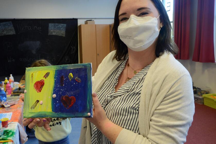 Kim Westerhof schaut derweil über die weiteren Bilder, die die Kinder gemalt haben. „Unser Beitrag heute mag ein kleiner Beitrag für den Frieden sein“, sagt sie mit Blick auf die Hilfstransporte, die auch von den Johannitern und ihren Partnern derzeit Richtung Osteuropa rollen. Mit fester Stimme setzt sie nach: „Doch in dieser furchtbaren Situation zählt jedes Zeichen, alles.“ Heute Morgen noch standen die Kinder in der Schule für eine Friedensaktion gegen den Krieg auf, auch das kleine Mäd­chen mit dem rosafarbenen Mund­schutz. Nun bringt sie ihre Gedanken auf die Leinwand und spricht über das, was ihr dabei durch den Kopf geht.