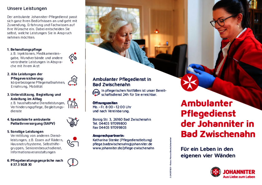 Geöffnet ist das Büro des ambulanten Pflegedienstes der Johanniter in Bad Zwischenahn montags bis freitags von 08:00 bis 12:00 Uhr sowie nach Vereinbarung.