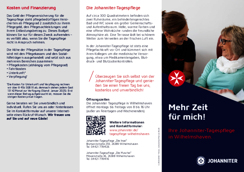 Auf fast 240 Quadratmetern Grundfläche bietet die Tagespflege-Einrichtung Platz für 15 Gäste. Die Räume sind modern und nach den neuesten Erkenntnissen im pflegerischen Bereich errichtet und hell und freundlich eingerichtet. Den Gästen stehen zahlreiche Ruhezonen sowie Bereiche für Aktivitäten und Zerstreuung zur Verfügung. Im Außenbereich gibt es einen weitläufigen Garten mit altem Baumbestand und einer großen Sonnenterasse. Für Menschen mit Behinderungen bieten wir natürlich auch für die Tagespflege im Norden der Stadt Wilhelmshaven unseren Johanniter-Fahrdienst an.