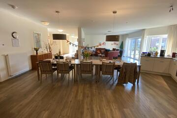 Die Räumlichkeiten lassen keine Wünsche offen: ein zu diesem Zweck 2019 erbautes Gebäude mit einem großzügigen Gemeinschaftsraum und offener Küche, freundliche Zimmer mit barrierefreiem Bad und ein großzügiger geschützter Garten. Des weiteren für die WG-Bewohner vorteilhaft ist, dass der Friseur, der Podologe und der Hausarzt regelmäßig Hausbesuche macht. Die WG befindet sich in einem ruhigen Neubaugebiet in der Nähe zum Kanal mit abgeschlossenem Garten für kleine Spaziergänge.