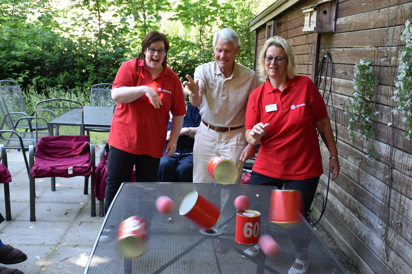 Solch eine Aktivität auf eine Woche auszudehnen, ist eine tolle Möglichkeit, noch intensiver auf die Gäste einzugehen. „Hier gilt das Prinzip dabei sein ist alles“, erzählt Christina Owczarzewicz, stellvertretende Leitung, „denn jede und jeder kann teilnehmen und es gibt keine Gewinner und Verlierer. Alle bringen sich mit ihren Stärken und Schwächen ein und können stolz auf sich sein.“ Vor allem aber fördern diese Spiele Biografiearbeit: Beim Dosenwerfen kommen so manche Erinnerungen an frühere Jahrmarktbesuche hoch. Hier nehmen sich alle Zeit fürs gemeinsame Erzählen, aber auch für Anerkennung und Lob.