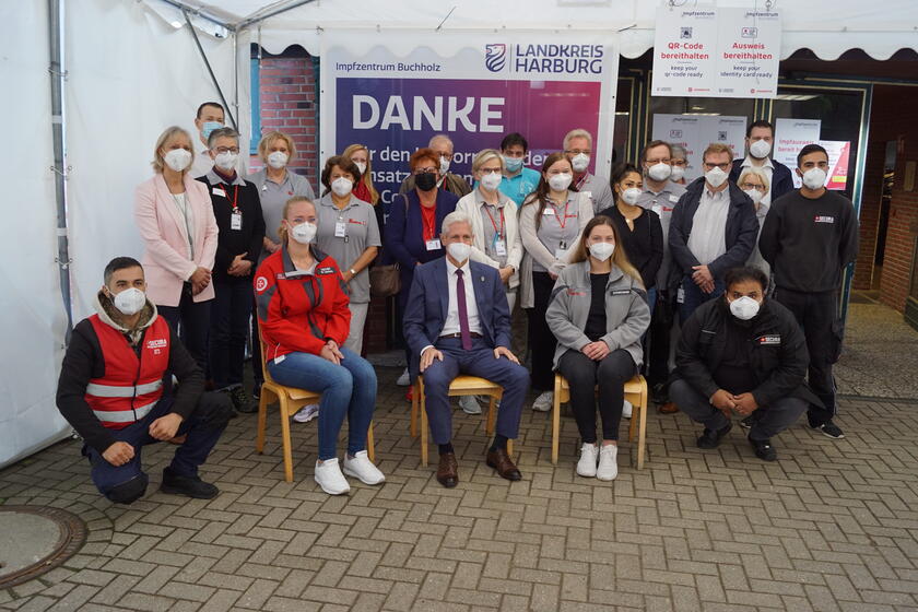 Nach mehr als 100.000 verabreichten Impfungen hat das Impfzentrum Buchholz heute seine Türen geschlossen. Am letzten Öffnungstag kam deshalb Landrat Rainer Rempe vorbei, um sich bei allen Mitarbeitenden zu bedanken.