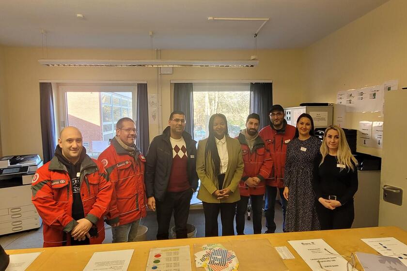 (v.I.n.r.) Tigran Yeghiazarayan (Hausbetreuer), Patrick Molzow (Leiter Betreuungsverband), Shayan Arian (Lager & Logistik), Aminata Touré (Intergrationsministerin), Feras Alhalaak (Hausbetreuer), Davit Tadevosyan (Hausbetreuer), Julia Wellmann (Sozial-und Konfliktberatung), Arzu Muslumova (Sozial-und Konfliktberatung)