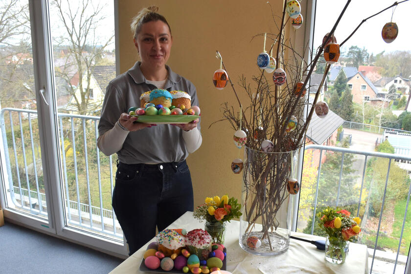 Der Besuch des Ostergottesdienstes ist für die meisten Ukrainerinnen und Ukrainer an diesem Feiertag wichtig, so dass die Mitarbeitenden der Johanniter in den Unterkünften in Neu Wulmstorf und Eddelsen eine kleine Andacht organisierten, bei der ukrainische Lieder gesungen und die Ostergeschichte auf Ukrainisch vorgelesen wurde. „Ostern ist ein Fest der Familie. An solchen Tagen vermissen unsere Bewohnerinnen und Bewohner ihre Angehörigen, die sie zurücklassen mussten, schmerzlich“, sagt Helen Klemusch-Frank, Leitung der Unterkunft in Neu Wulmstorf. Traditionell wird an Ostern das selbst gebackene ukrainische Osterbrot „Paska“ gegessen. Mit viel Liebe zum Detail wird das Hefegebäck mit der charakteristischen hohen Form mit Zuckerguss und bunten Perlen verziert. Als Vorbereitung auf das Osterfest hatten die Bewohnerinnen und Bewohner in den vergangenen Wochen viele Ostereier bemalt, die nun die Wände und Ostersträuße der Unterkünfte schmücken.