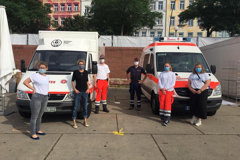 Den medizinischen Part übernahmen eine mobile Arztsprechstunde, zwei ehrenamtliche SanitäterInnen der Hamburger Johanniter und das Gyn-Mobil der Johanniter mit einer Frauenärztin und einer Hebamme vom Women’s Health Team. Das Women’s Health Team ist eine Gruppe von ehrenamtlichen Hebammen und Gynäkologinnen, die eine offene, kostenfreie Sprechstunde für geflüchtete Frauen, Obdachlose und Frauen ohne Papiere anbieten.