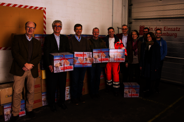 Die Hamburger Kommende des Johanniterordens packte gemeinsam mit Mitarbeitenden der Johanniter-Unfall-Hilfe Pakete für die Sammelaktion Weihnachtstrucker.