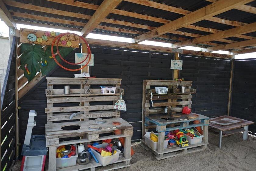 Auch unser Außengelände ist mit altersgerechten Spielgeräten ausgestattet. Hier haben die Kinder die Möglichkeit ihre motorischen Fähigkeiten unter anderem am Klettergerüst zu fördern. Ein weiteres Highlight ist unsere Matschküche. Hier können die kleinen Entdecker nach Herzenslust mit Sand, Erde und Wasser kochen, backen und experimentieren.