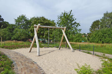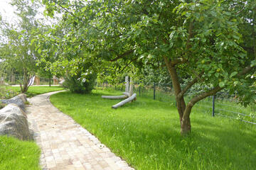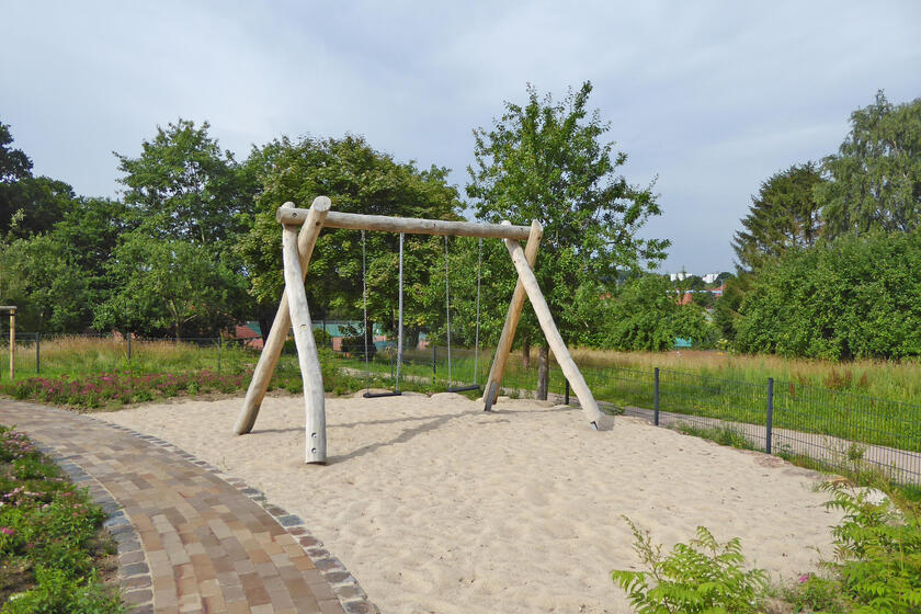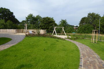 Das Außengelände hat eine leichte Hanglage mit Blick auf Wiese und Wald sowie das Schulzentrum. Die Kita wurde auf dem Gelände einer alten Obstwiese gebaut, alter Baumbestand wurde zum Teil erhalten, sodass verschiedene Obstbäume hier als Schattenspender dienen. Ein angelegter Weg schlängelt sich durch das Gelände und lädt ein, mit kindegerechten „Fahrzeugen“ aller Art befahren zu werden. Weitere Spielmöglichkeiten sind ein Kletterelement mit Haus, Hängebrücke und Rutsche, eine Sandkiste sowie Schaukeln. In einem abgeteilten Bereich gibt es ein kleines Fußballfeld mit Toren und ein Gartenhaus für Spielgeräte und Fahrzeuge. Auf dem Gelände ist ein gesonderter Bereich für Krippenkinder angelegt worden. Hier sind eine kleine Sandkiste zum Buddeln sowie eine Sandkiste mit einer Kletter- und Rutschmöglichkeit vorhanden. Dieses Areal ist zum abfallenden Bereich durch einen Holzzaun geschützt.