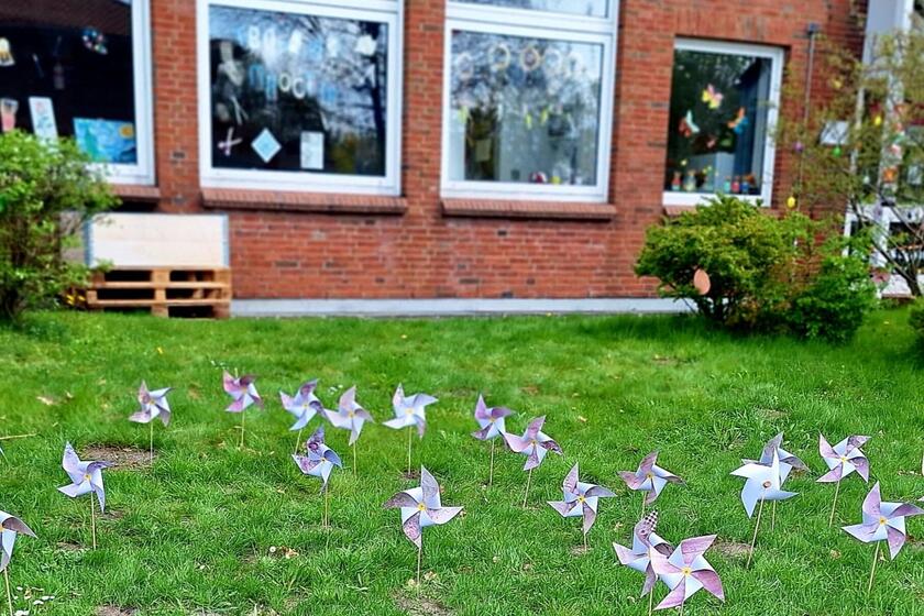Unsere kleinen Bewohner aus dem Haus der Kinder nutzten die ersten warmen Frühlingstage und die steife Brise von der Nordsee, um den ersten Windpark des Jahres in der Landesunterkunft aufzubauen.
