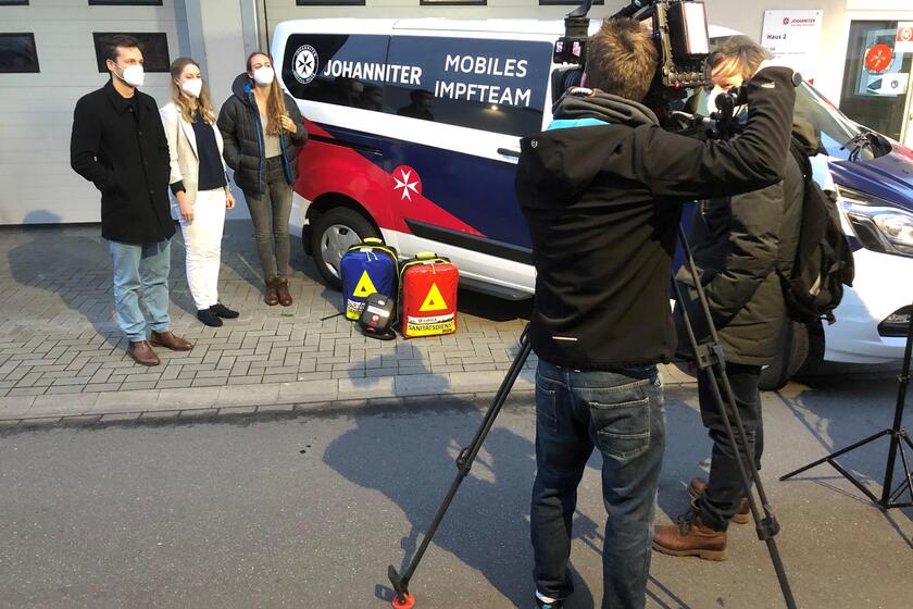 Heute nehmen die mobilen Impfteams ihre Arbeit auf: Drei Teams der Johanniter aus Lübeck gehören zu den ersten Impfteams, die ab sofort Menschen in Pflegeheimen gegen das Corona-Virus impfen werden. Der Impfstoff war vom THW an die Johanniter übergeben worden. Den Impfstart in Schleswig-Holstein begleiteten Ministerpräsident Daniel Günther, Gesundheitsminister Dr. Heiner Garg und Dr. Monika Schliffke, Vorstandsvorsitzende der Kassenärztlichen Vereinigung Schleswig-Holstein (KVSH). Im Beisein von Johanniter-Regionalvorstandsmitglied Kai-Uwe Preuß und Anette Langner, DRK Landesverband Schleswig-Holstein, bedankten sie sich im Rahmen einer Pressekonferenz bei den beteiligten Organisationen und den insgesamt zehn mobilen Teams, die mit den Impfungen beginnen werden. Einen besonderen Dank sprachen sie gegenüber den zahlreichen Helferinnen und Helfern der Hilfsorganisationen aus: Diese hätten den logistischen und organisatorischen Kraftakt innerhalb kürzester Zeit umgesetzt.