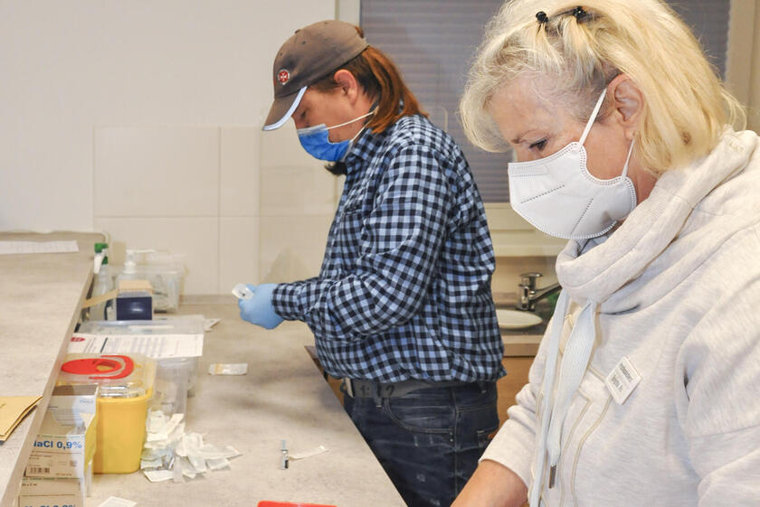 Helge Timm (Einsatzleitung Sanitätsdienste Johanniter) und Brigitte Ax (Impfassistentin in der Impfstelle) bereiten die Spritzen für das erste Kinderimpfen in Quickborn vor.