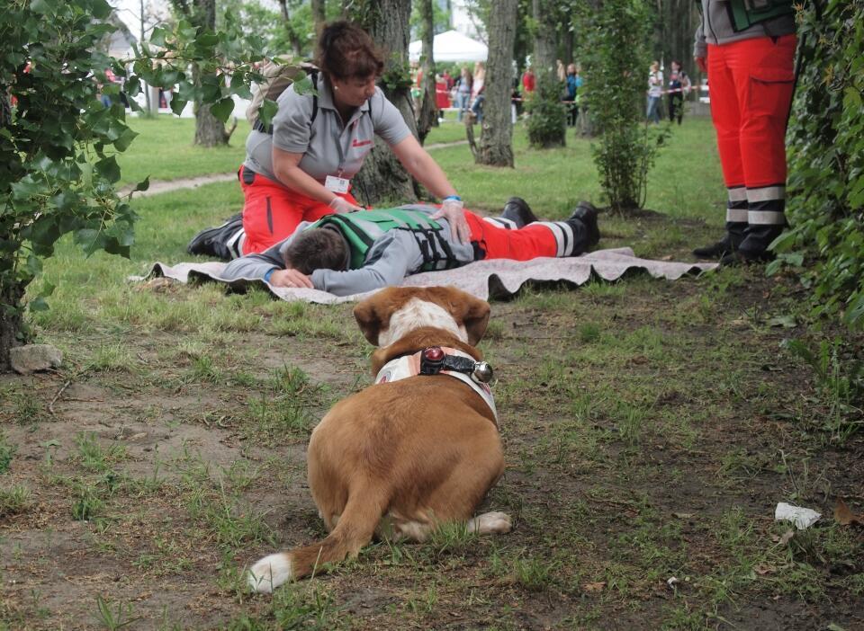 Normalerweise sind sie im Einsatz, wenn Menschen vermisst werden: Beim Erste-Hilfe-Wettkampf zeigen die zwei- und vierbeinigen Mitglieder unserer Rettungshundestaffeln in der Kategorie H das perfekte Zusammenspiel von Mensch und Hund unter Wettkampfbedingungen. Den Theorie-Test müssen die Rettungshundeführer allerdings ohne Unterstützung der Spürnasen lösen und auch den Tragetest über den Hindernisparcours bewältigen die Zweibeiner ohne tierische Begleitung. Ihren großen Auftritt haben die Rettungshunde gemeinsam mit ihren Hundeführererinnen und -führern bei den Verweis-, Gewandtheits- und Orientierungsübungen. Zum Beispiel müssen die Rettungshunde auf das Kommando ihrer Hundeführer über eine Wippe balancieren oder durch einen Stofftunnel laufen.