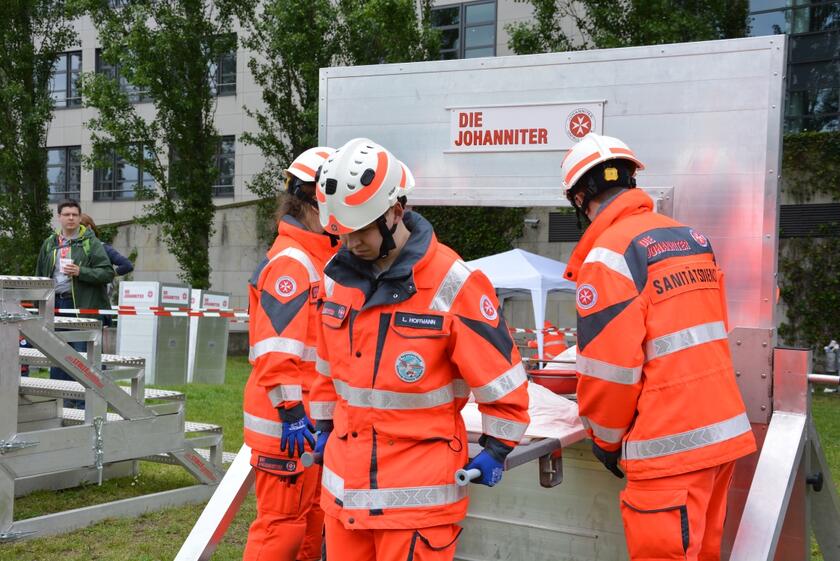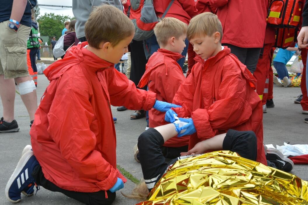 Fürs Retten ist man nie zu jung. Das beweisen eindrucksvoll die kleinsten Ersthelfer in der Kategorie C der Kinder zwischen sechs und zwölf Jahren. Sie haben den Kurs "Ersthelfer von morgen" absolviert und treten in Teams von sechs bis acht Teilnehmenden an. Sie glänzen mit theoretischen Wissen ebenso wie mit praktischen Handgriffen und meistern bravourös den Kooperativ-Test, bei dem sie als Mannschaft eine Strecke mit Hilfsmitteln, z. B. Kisten, überwinden müssen, ohne den Boden zu berühren. Im großen Praxistest zeigen sie an kindgerechten Fällen, dass zur Ersten Hilfe immer auch das Trösten gehört - und dass sie den Großen in nichts nachstehen. Statt der Herz-Lungen-Wiederbelebung steht für die jüngsten Retter ein Kreativ-Test an: Hier geht es um echten Teamgeist und Johanniter-Gemeinschaft.