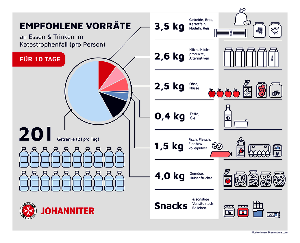 Das Bundesamt für Bevölkerungsschutz und Katastrophenhilfe (BBK) empfiehlt, Lebensmittel für mindestens zehn Tage zu bevorraten. Pro erwachsener Person sollten etwa 2.200 Kilokalorien täglich eingeplant werden. Geeignete Lebensmittel sind: