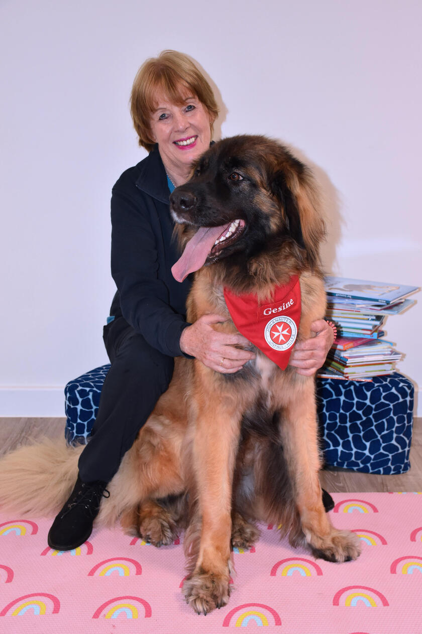 Harmine Dörflein hat ihre Leonberger-Hündin Gesine zum Bücherhund ausbilden lassen. Gemeinsam mit ihrem ehrenamtlichen Team der Bücherhunde aus dem Johanniter-Ortsverband Buchholz will sie Kindern mit Leseschwäche helfen, die Welt der Bücher zu erschließen.