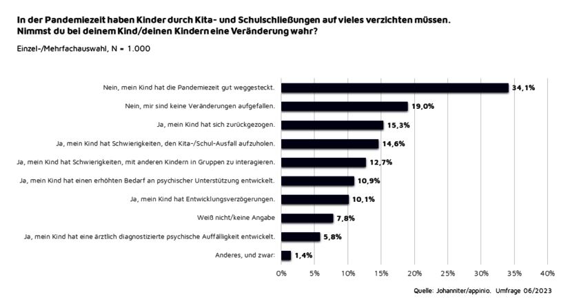 Thematisch lassen sich die 1.000 anonymen Antworten in die fünf Kategorien Bildung und Förderung, soziale Kontakte und Gemeinschaft, Unterstützung und Betreuung, Bewegung und Freizeitangebote sowie Bedürfnisse von Kindern in der Gesellschaft aufteilen. Mehrere Befragte beklagen zum Beispiel, dass auch nach der Pandemie aufgrund des Personalmangels an Schulen häufig der Unterricht ausfällt. „Genügend Erzieher, Lehrer, Schul- und Kitasozialarbeiter fände ich wichtig. Personalmangel baden die Kinder ständig aus. Schön wären gezielte Nachhilfeprogramme, soziale Gruppenprojekte, organisierte Jugendtreffs und Verständnis seitens der Politiker, dass Corona Kinder und Jugendliche doch sehr nachhaltig betroffen hat“, schreibt ein Elternteil. Dass Kinder generell häufig hintenanstehen, bemerken andere. „Kinder brauchen mehr Aufmerksamkeit. Nicht nur durch die Pandemie, sondern auch im Allgemeinen werden die Bedürfnisse von Kindern in Deutschland nicht gewürdigt. Sie sind gefühlt am Ende der Kette unseres politischen Systems. Man sollte Kinder in Deutschland viel mehr in den Vordergrund rücken und das Land endlich kinderfreundlicher gestalten“, findet ein Elternteil. Mehr Wertschätzung fordert eine weitere Person: „Kinder brauchen Unterstützung, sie müssen ernst genommen werden, sie brauchen jemanden, der sie sieht und ihnen zuhört.“