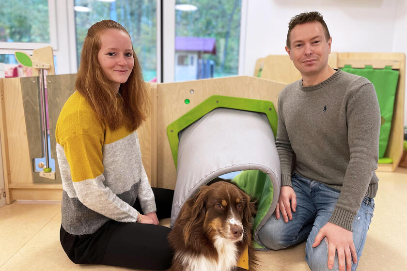 Philipp Niemeyer (re.), Leiter der Johanniter-Kita „Gipfelstürmer“ in Dörentrup, freut sich auf die Anmeldungen und wartet mit einer besonderen Überraschung auf die Neuankömmlinge: Therapiehund Bailey, der mit Frauchen Tabea Langer inzwischen ein festes Mitglied im Kita-Team ist.