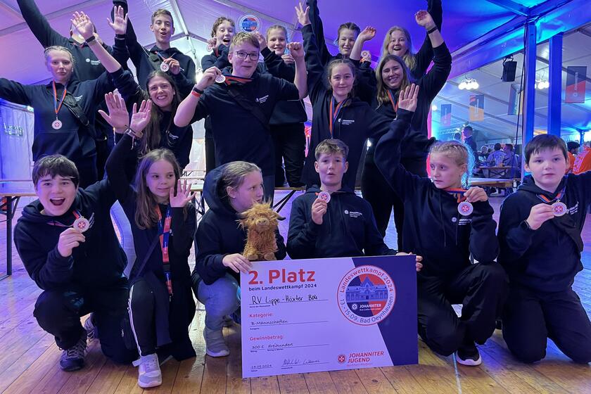 Beim „Tag der Johanniter“ – den Erste-Hilfe-Wettbewerben der Johanniter NRW – hat die Mannschaft aus dem Regionalverband Lippe-Höxter den zweiten Platz belegt. In der Kategorie der B-Mannschaften mit 12-18-jährigen Ersthelfenden aus der Johanniter-Jugend setzte sich das Team um Leonie-Celine Jäger und Lukas Wiebusch durch und gewann den Pokal sowie ein Preisgeld in Höhe von 300 Euro für die Zweit-Platzierten. „Das viele Training hat sich gelohnt“, sagte Regionaljugendleitung Celina Beverung. „Vor allem, weil es uns allen viel Spaß gemacht hat.“ „Wir sind sehr glücklich und stolz auf unser Team“, so Dr. med. Johann P. Addicks, Mitglied im Regionalvorstand. „Bei dem großen Können der besten Rettungs- und Nachwuchsmannschaften in NRW ist unsere Platzierung ein großer Erfolg.“