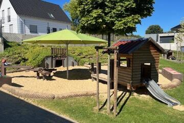 Unser Außengelände ist großzügig angelegt und der naturnah gestaltete Spielplatz lädt zum Erforschen, Erleben, Erkunden und phantasievollen Bespielen ein. Kinder finden bei uns alles, was ihr Herz begehrt: eine Matsch-Anlage, eine echte Küchenzeile, Schaukeln und Rutschen, Fischerhütten, einen Sprungbalken, eine Bewegungsbaustelle mit verschiedenen Holzbrettern zum Bauen, einen Hexenturm mit Hangelbalken und angrenzendem Turn-Reck. Darüber hinaus gibt es für unsere Kinder einen Goldgräberstollen im angrenzenden Sandbereich und eine Ponywiese mit zwei Pferden. Für die Fahrzeuge gibt es eine schöne Tanksäule und an der Bushaltestelle können andere "Mitfahrer" abgeholt werden. Die geistige, soziale und motorische Entwicklung der Kinder wird in unserer Einrichtung gezielt gefördert.