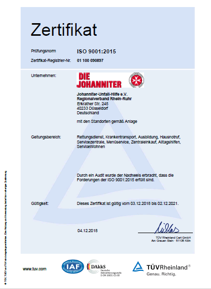 Die Johanniter im Regionalverband Rhein-Ruhr sind nach DIN EN ISO 9001:2015 durch den TÜV Rheinland geprüft und erfolgreich in folgenden Punkten zertifiziert worden: