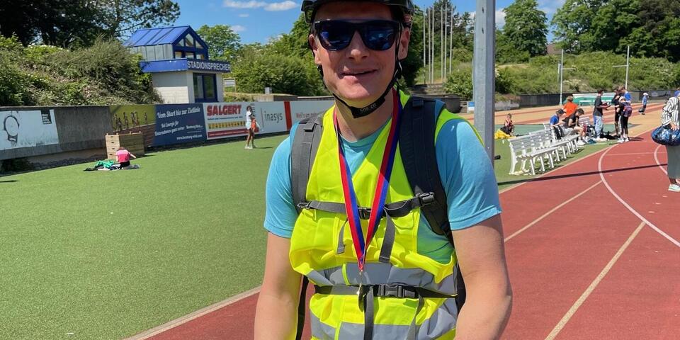 Bereits am darauffolgenden Montag rollten die Räder weiter: Beim Spendenlauf des Anno-Gymnasiums unter dem Motto „ANNO AND FRIENDS – STRONGER TOGETHER“ war die Rikscha erneut im Einsatz. Pilot Laurens Müller drehte unermüdlich Runde um Runde im Stadion – erst mit Fotografen und Zuschauern, später mit Lehrpersonal und der Schülerschaft. Ganze vier Stunden blieb er im Sattel – am Ende wurde er für seinen Einsatz sogar mit einer Medaille geehrt. „Im Stadion konnte ich mal so richtig schnell fahren“, berichtete Müller lachend, „das ist im normalen Straßenverkehr ja nicht möglich.“