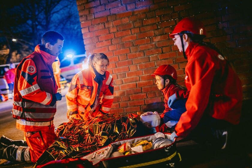 Eine junge Frau liegt auf dem kalten Pflasterstein unweit des Unfallwagens. Sie klagt über starke Schmerzen, ihr Knie blutet. "Vermutlich ein Bruch", sagt eine Helferin, markiert das gelbe Feld auf dem Sichtungszettel und spricht beruhigend auf die "Verletzte" ein: "Wir sind hier und kümmern uns um Sie. Die Rettungskräfte sind gleich da." Kurz darauf heult eine Sirene auf und ein weiterer Rettungswagen fährt auf den Vorplatz. Die Verstärkung trifft ein. Die Jugendlichen bilden Teams und machen sich an die Arbeit. Wunden werden versorgt, Brüche geschient, die Lage stabilisiert. Immer unter der Anleitung von erfahrenen Rettungskräften, die bei Fragen zur Seite stehen.