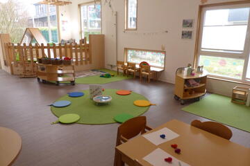 Wir betreuen 35 Kinder, im Alter von vier Monaten bis zum Schuleintritt, in zwei Gruppen (eine U3 Gruppe und eine Ü3 Gruppe). In offenen Funktionsbereichen (wie beispielsweise Bauecke, Atelier, Turnhalle, Leseecke…) können die Kinder selbsttätig und selbstbestimmt in ihrem eigenen Tempo forschen, ausprobieren und entdecken. Partizipation bedeutet für uns Mitbestimmung, Einbeziehung und Beteiligung der Kinder. Wir sehen jedes Kind als individuelle Persönlichkeit und Akteur seiner eigenen Entwicklung an. Die religionspädagogische Arbeit ist im Alltag unserer ganzheitlichen Pädagogik fest verankert. Es finden monatlich christliche Morgenkreise statt, in denen anhand von Bibelgeschichten verschiedene Themen und bedeutsame christliche Feiertage besprochen werden. Entsprechend unseres Leitbildes steht der Mensch, dem wir mit Respekt begegnen, im Mittelpunkt unseres Handelns. In unserer Einrichtung sind unterschiedliche Nationen und Religionen vertreten.