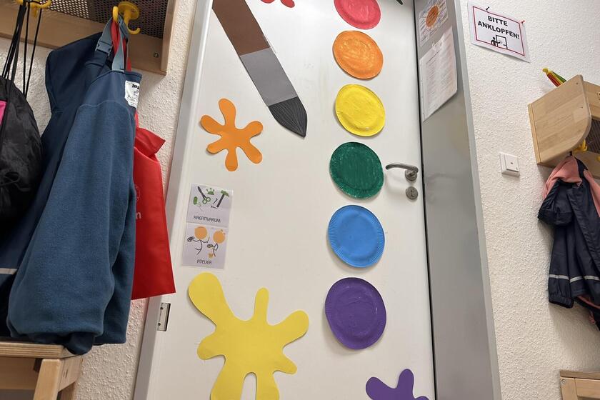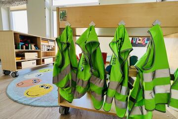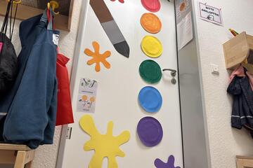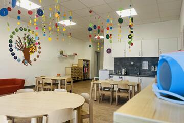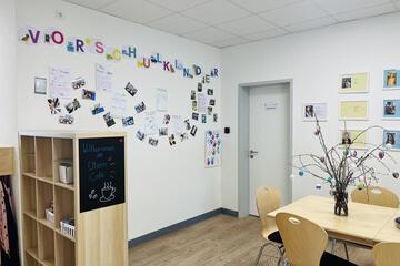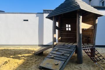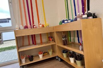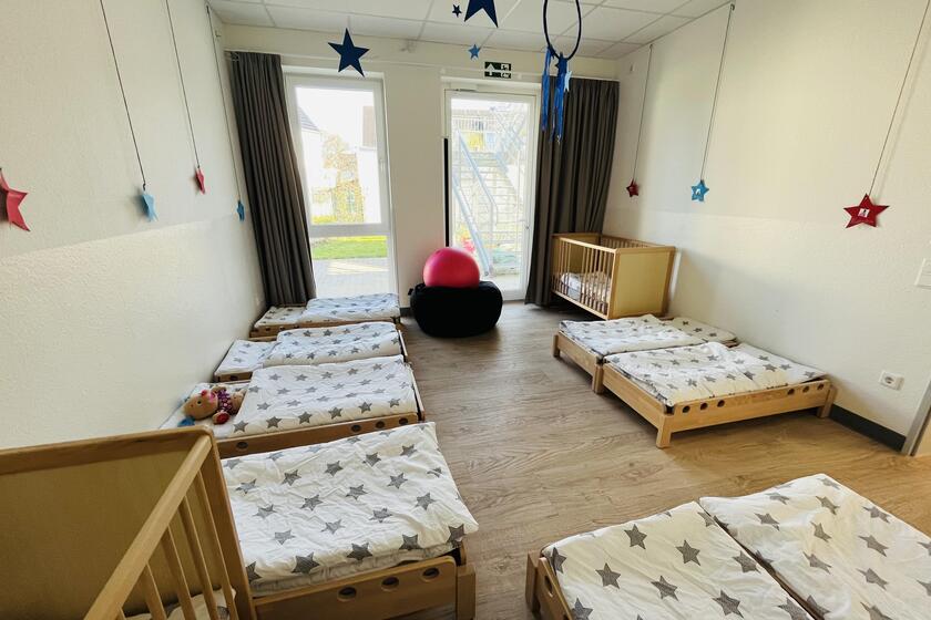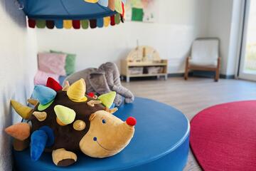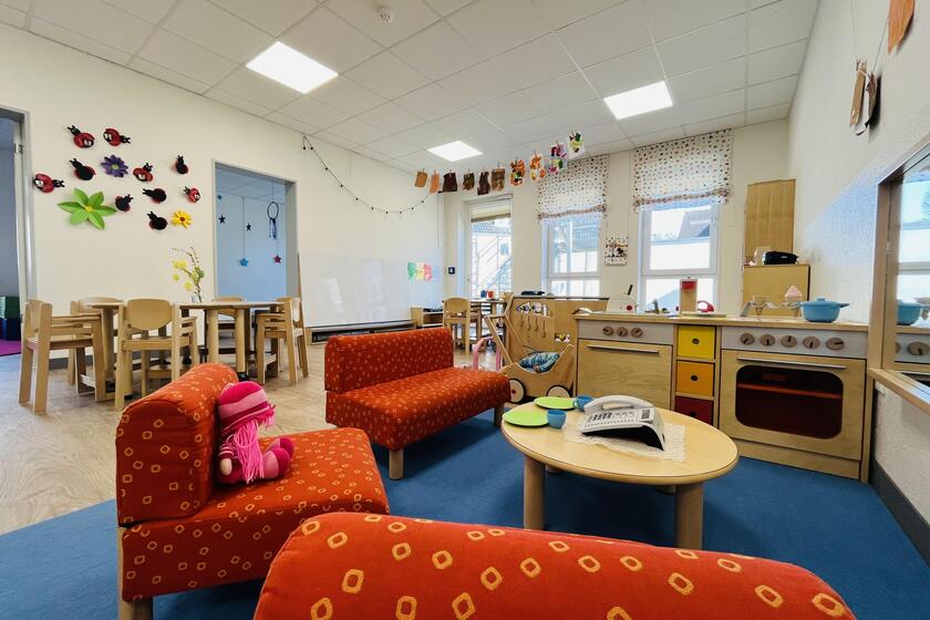 Die Kita erstreckt sich auf zwei Ebenen und bietet auf zwei Außenspielbereichen und einem großen Bewegungsraum genug Platz für die Betreuung von 85 Kindern, verteilt auf 5 Gruppen.
