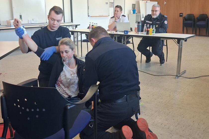 Mit unseren zertifizierten Ausbildern Lena Russkowski und Jochen Ortmann haben wir als Johanniter die Fortbildung im Bereich der Notfallmedizin fachlich begleitet und unterstützt. Ziel war es, die Teilnehmer darauf vorzubereiten, im Einsatz die Zeit bis zum Eintreffen des Rettungsdienstes kompetent zu überbrücken.