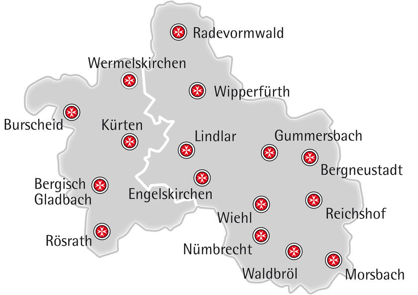 Die Johanniter im Regionalverband Rhein.-/Oberberg sind eine lebendige Gemeinschaft aus über 800 ehrenamtlichen und hauptamtlichen Mitarbeiterinnen und Mitarbeitern, deren vertrauensvoller Umgang miteinander von Achtung und Respekt geprägt ist. Auf der von uns zu betreuenden Fläche von 1356 Quadratkilometern leben fast 600.000 Menschen in 21 Städten und Gemeinden. Die Johanniter sind mit dieser Region seit Jahrhunderten eng verbunden. Dies wird beispielsweise sichtbar durch das achtspitzige Johanniterkreuz im Wappen der oberbergischen Stadt Wiehl - dem Sitz unserer Geschäftsstelle.