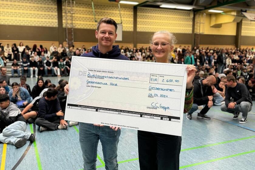 Dieses wunderbare Ergebnis wurde heute Morgen in der Sporthalle bei einer gemeinsamen Zusammenkunft aller Klassen von der stellvertretenden Schulleiterin Swantje Schweppe verkündet. Vor tobendem Applaus der Schülerschaft, die sich riesig darüber freute, überreichte sie Robin Beckmann (Social Media Manager, Presse & Öffentlichkeitsarbeit) den Spendenscheck. 👏