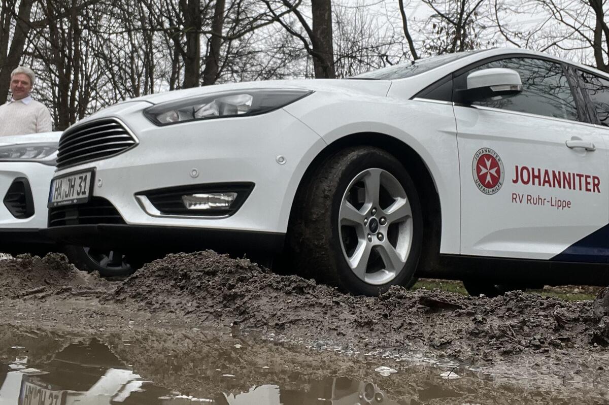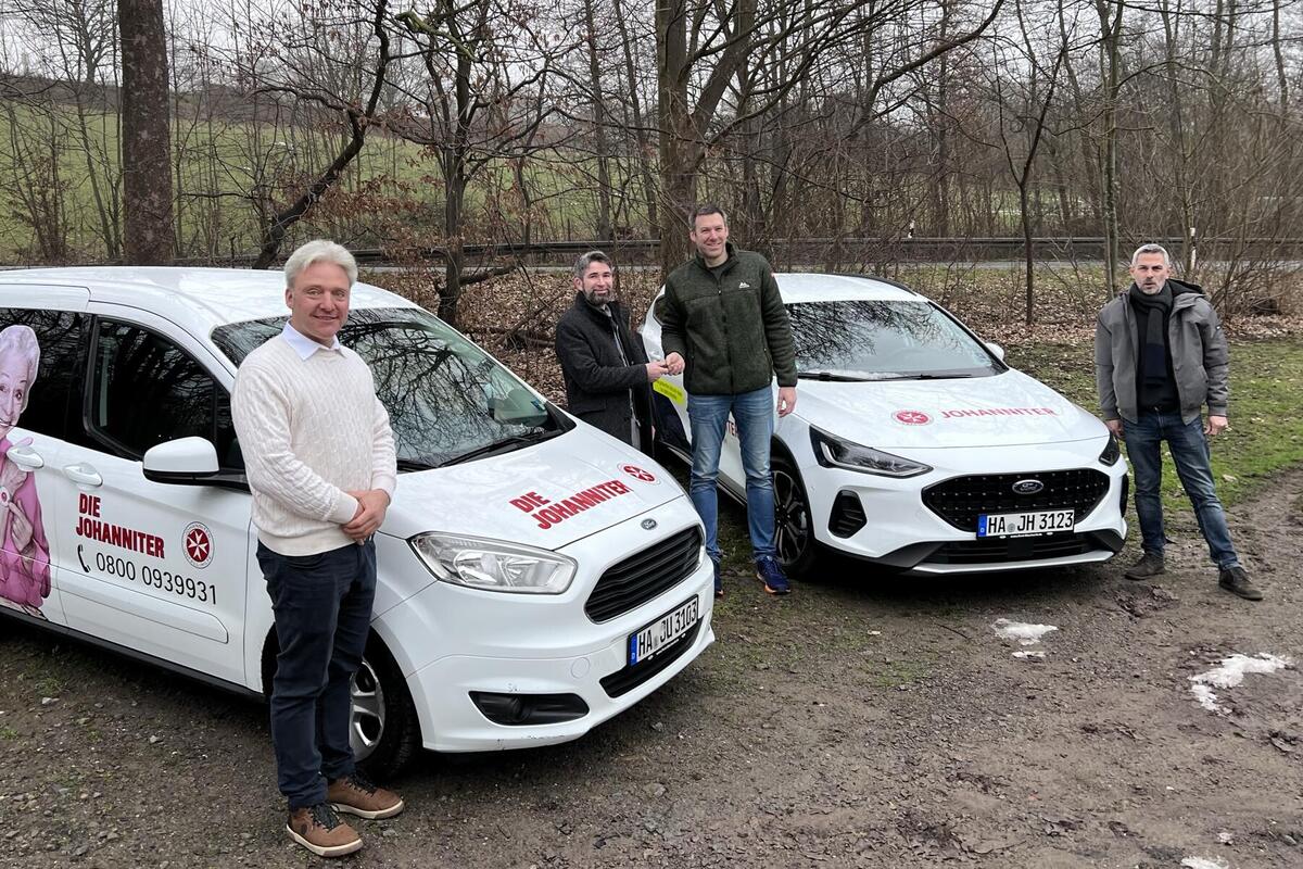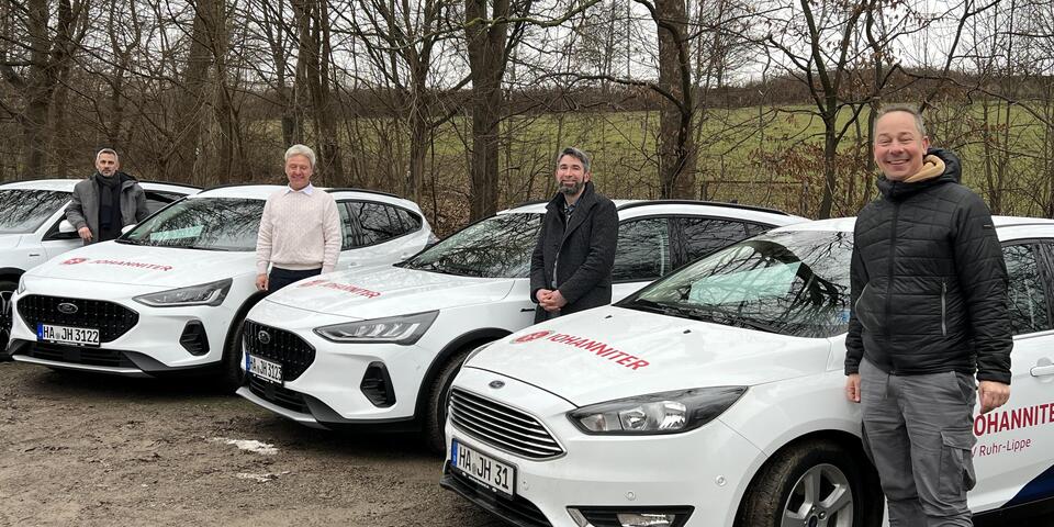 Direkt zum Start 2023 wurden heute in Herdecke unter der Leitung von André Paudtke, Leiter für Zentrale Dienst, und Sebastian Jacob, Fachbereichsleitung Notrufdienste, Marketing & Vertrieb, die neuen Fahrzeuge für die Hausnotrufstandorte Hagen, Bochum und Gelsenkirchen übergeben.