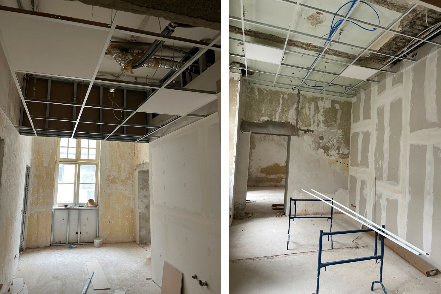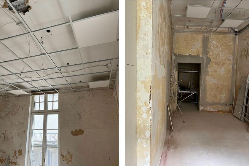 Jetzt im Juli sieht man bereits den Fortschritt an den Deckenarbeiten in den hohen und luftigen Räumen einer ehemaligen Klinik.