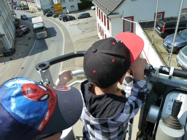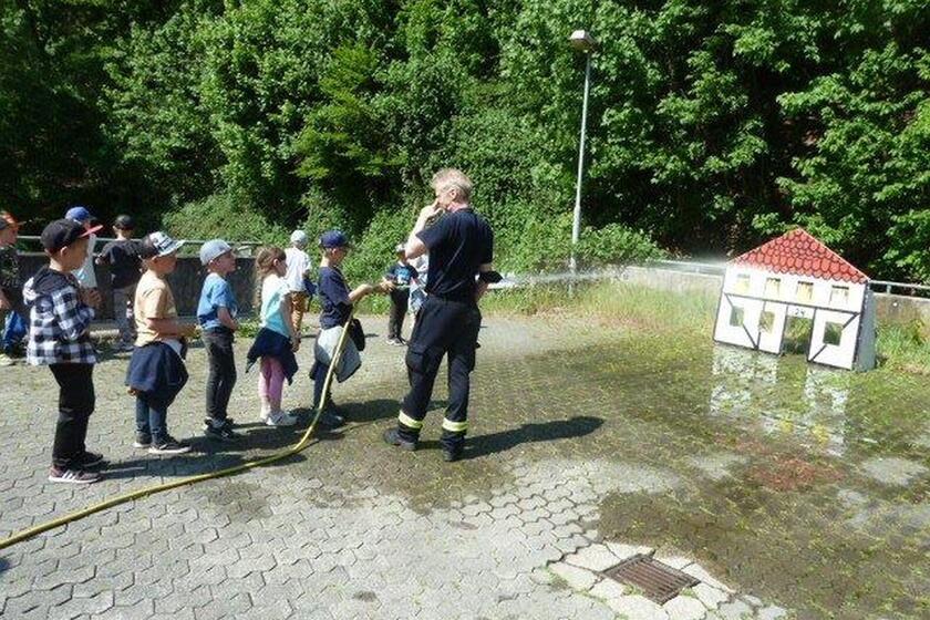 Beim Besuch der Feuerwehr Altena konnten die Kinder sehen, welche Montur eine Löschkraft anlegt, bevor sie in den Einsatz geht. Die Kinder erfuhren, wie man sich bei einem Feuer verhält: Wenn man sich am Fenster bemerkbar macht, kann die Feuerwehr mit dem Hubrettungsfahrzeug und seiner Drehleiter kommen und die Menschen retten. Mit dem Hubwagen abheben, das konnten die Kinder ebenso, wie das Löschen nachspielen, indem sie Holzflammen an einer Hausfassade umgespritzt haben.