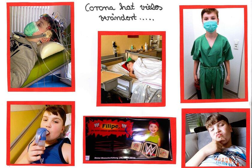 Laut Bundesfamilienministerium leben in Deutschland rund 50.000 Kinder, Jugendliche und junge Erwachsene mit einer unheilbaren Erkrankung. Vom Ambulanten Johanniter-Hospizdienst für Kinder und Jugendliche „Kleine Raupe“ werden derzeit zehn Familien mit einem lebensverkürzend erkrankten Kind in Südwestfalen begleitet. Zu ihnen gehört der zehnjährige Filipe aus Hemer, der derzeit einen stark eingeschränkten Alltag erlebt. Wie Corona sein Leben verändert hat, veranschaulicht der Junge mit den Erkrankungen Mukoviszidose und Diabetes in einer Collage, die er für den Johanniter-Hospizdienst angefertigt hat: Seine häufigen Krankenhausaufenthalte dürfen zum Glück zwar von seiner Mutter begleitet werden, andere Familienmitglieder können ihn in der Klinik jedoch nicht besuchen.
