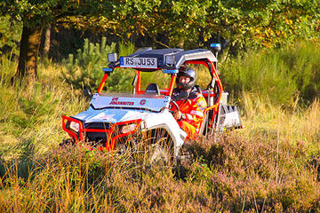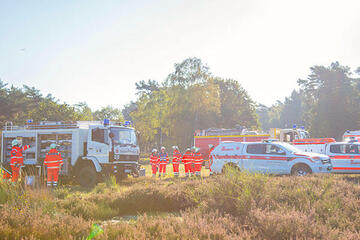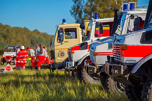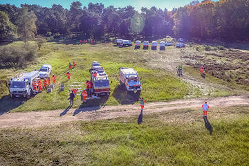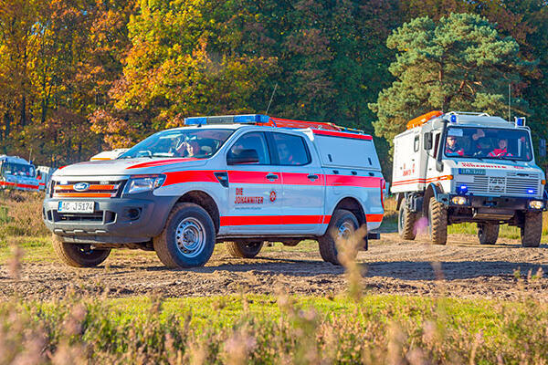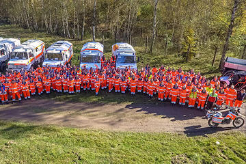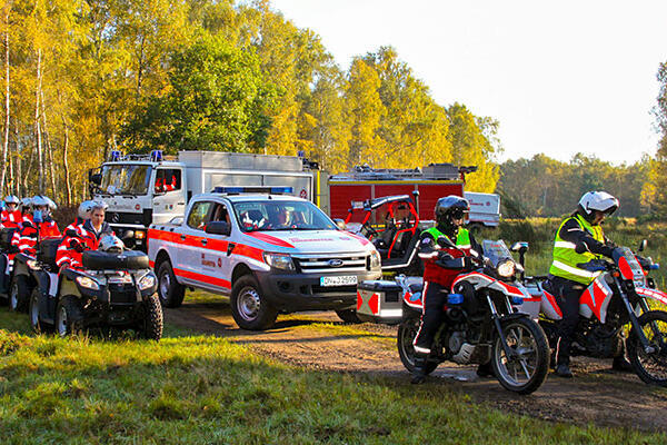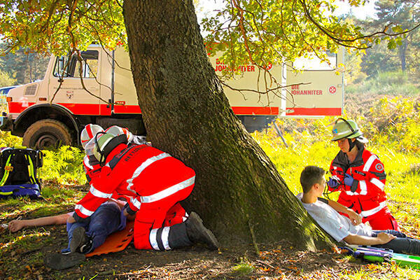 Laut Übungs-Szenario waren die regulären Rettungsdienste der Region bei dem angenommenen, großflächigen Extremwetter-Ereignis anderweitig gebunden. So war es in der Vergangenheit oft vorgekommen. Deshalb agierten die insgesamt 200 Katastrophenschützerinnen und -schützer der Johanniter-Unfall-Hilfe autonom. Sie installierten neben einem Gesamteinsatzleiter das Führungsfahrzeug Einsatzleitwagen 2 (ELW). "Von hier aus wurde die Suche nach den Vermissten koordiniert", erläutert Richard Krings, Fachbereichsleiter Einsatzdienste: "Mit dem Einsatz der Aufklärungsdrohne und mit mehreren Suchtrupps, die sich mittels Quads und Motorrädern im Gelände bewegten, konnten die Rettungskräfte die Personen finden und die erste Versorgung sicherstellen." Mit Kradmeldern und via Digitalfunk informierten sie die Leitung im ELW über das Auffinden und die Sichtungskategorie der Verletzten (Triage) und forderten je nach Fall weitere Rettungsmittel an. Zehn Helfer besetzten vier Unimog-Krankentransportwagen und einen Unimog-Rettungstransportwagen und steuerten punktgenau die "roten" und "gelben" (schwer und leichtverletzten) Personen an.