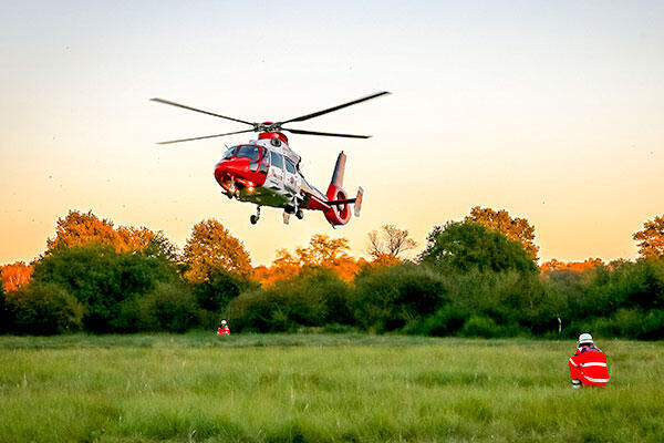 Nach einer fachgerechten Übergabe nahmen die geländegängigen Rettungsmittel die Patienten auf und brachten sie zur parallel eingerichteten Verletztenablage im Feld und danach zum Behandlungsplatz 50 abseits des Kernschadensgebietes. Aufgrund der Verletzungsschwere einiger Patienten und der angenommenen Auslastung der nahegelegenen Krankenhäuser, erfolgte die Alarmierung des SAR-Hubschraubers der Bundeswehr und des Intensivtransporthubschraubers Akkon Bochum der Johanniter-Luftrettung. Letzterer war nach kurzer Zeit am ausgewählten und markierten Landeplatz und nahm die Patienten zum Weitertransport auf. Dadurch wurde auch die letzte Schnittstelle zwischen den ineinandergreifenden Abschnitten der Katastrophenschutz-Einheit erfolgreich geübt.